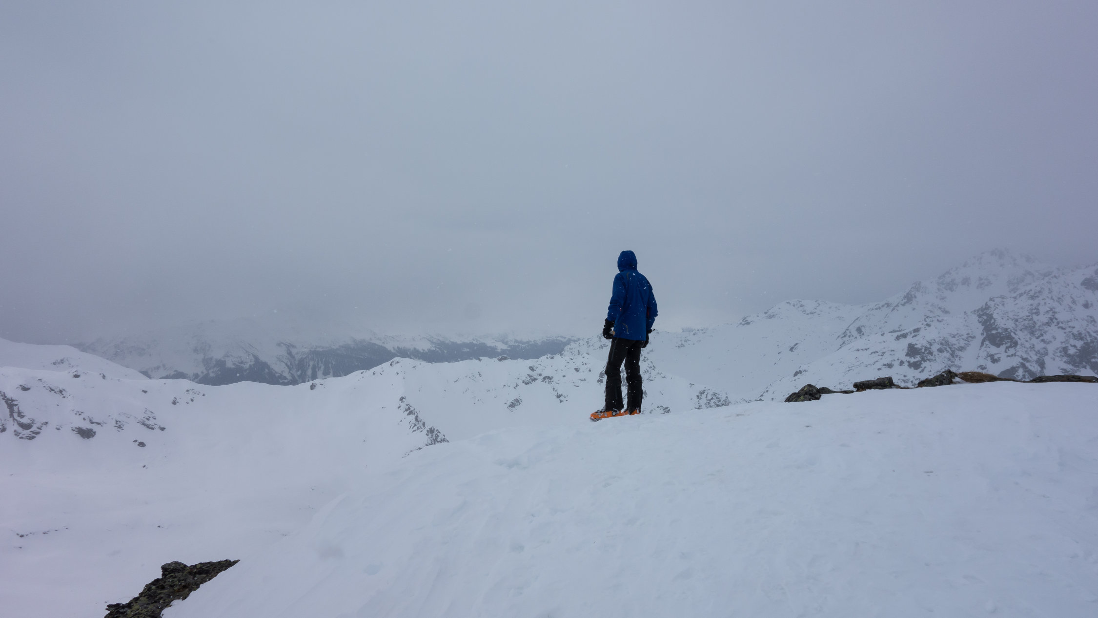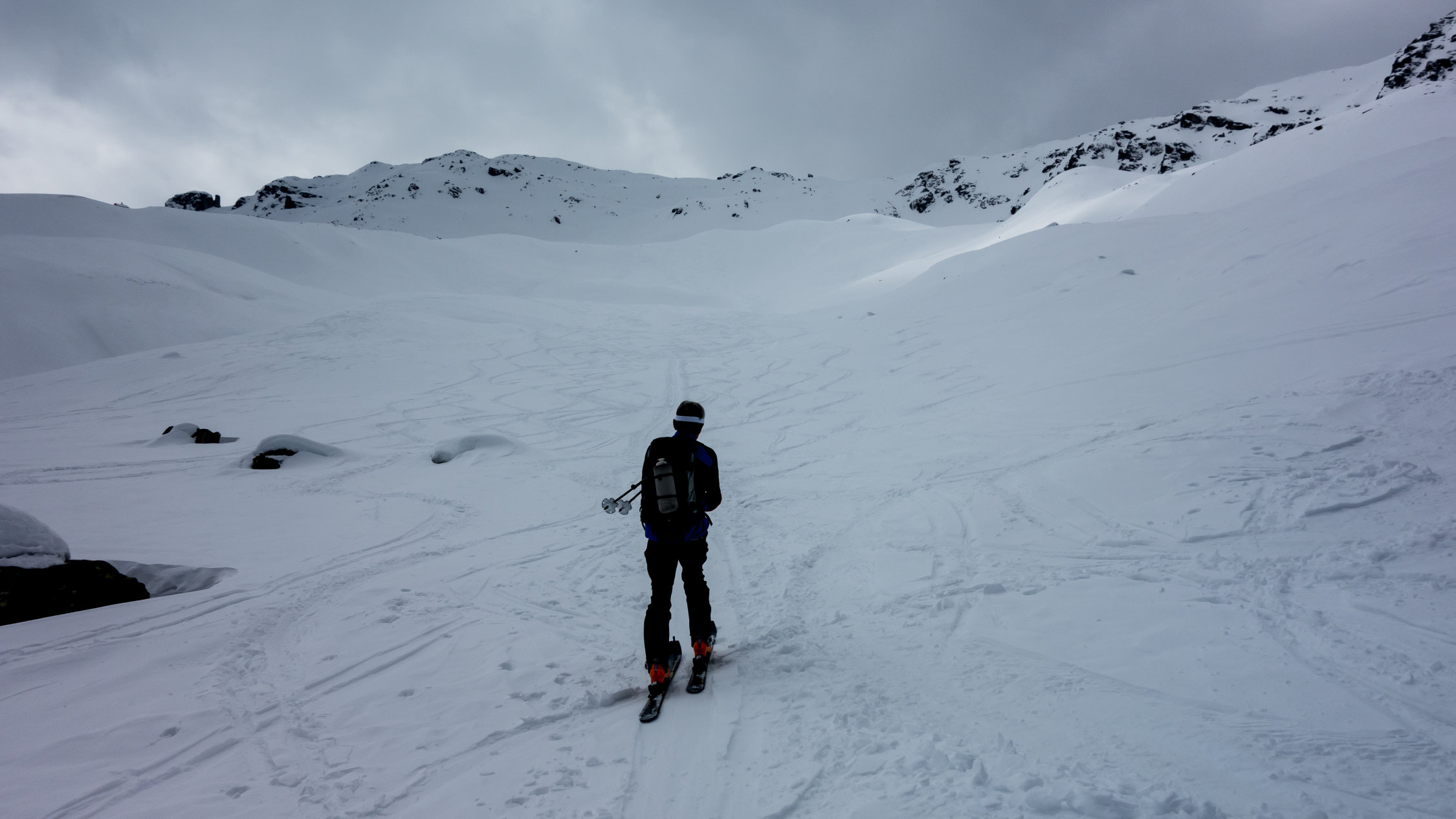 Am Morgen noch sonnig, dann zunehmende Bewölkung und bei der Abfahrt schlechte Sicht. Wir sind vom Gipfel direkt die steilen Hänge südwärts zur Oberen Valzifenzalpe (1838 m) abgefahren. Leider sind diese Hänge heute nicht aufgefirnt infolge des bewölkten Wetters. Dies wäre bei Firn eine wunderschöne Abfahrt. Ab Valzifenzalpe sehr flach zurück nach Gargellen, der letzte Teil auf der Skipiste.