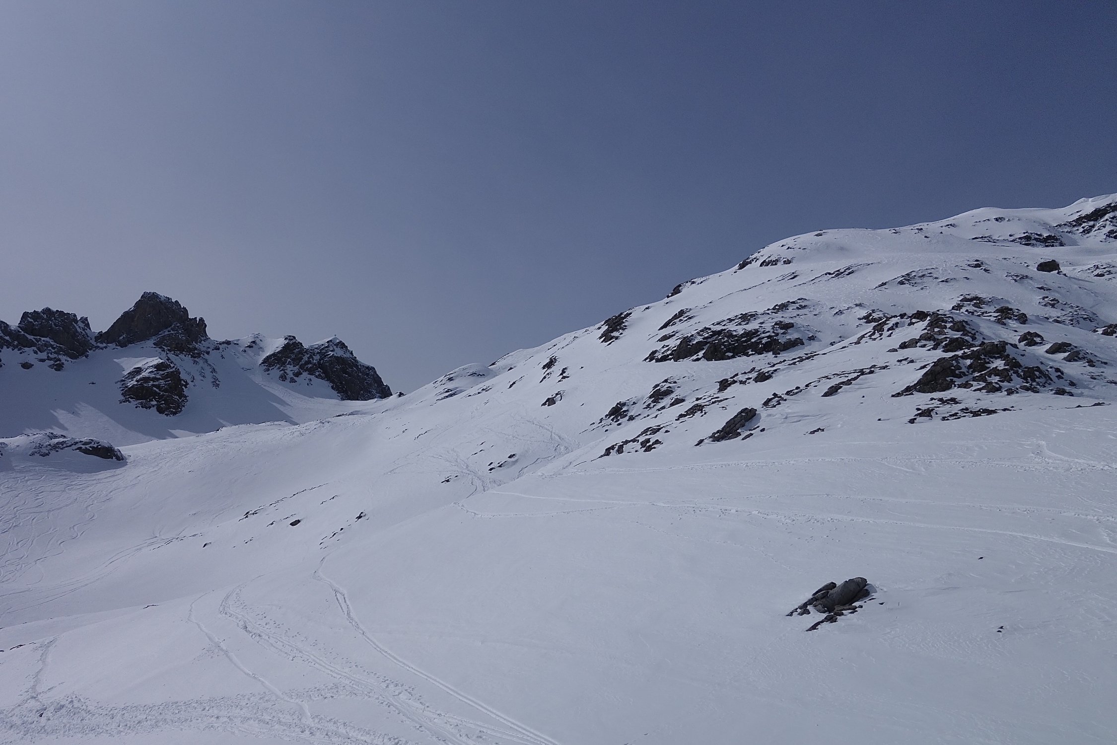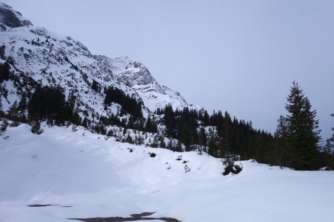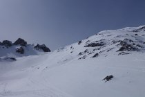 Abfahrt zur Rüfi z.T. über die steileren Hänge rechts. In der Rüfi hat es einen grösseren Lawinenkegel, der aber gut eingeschneit ist.
