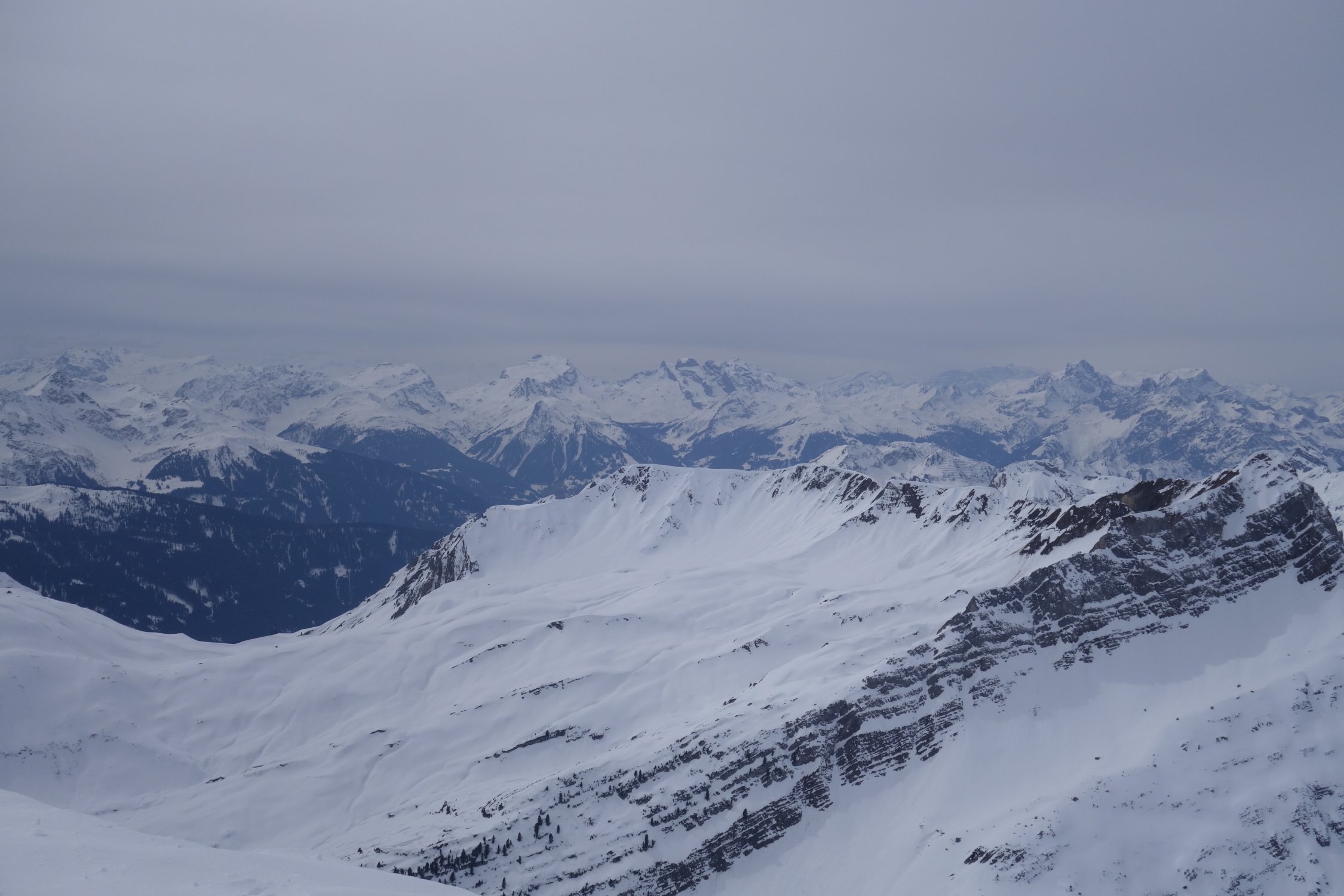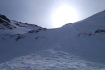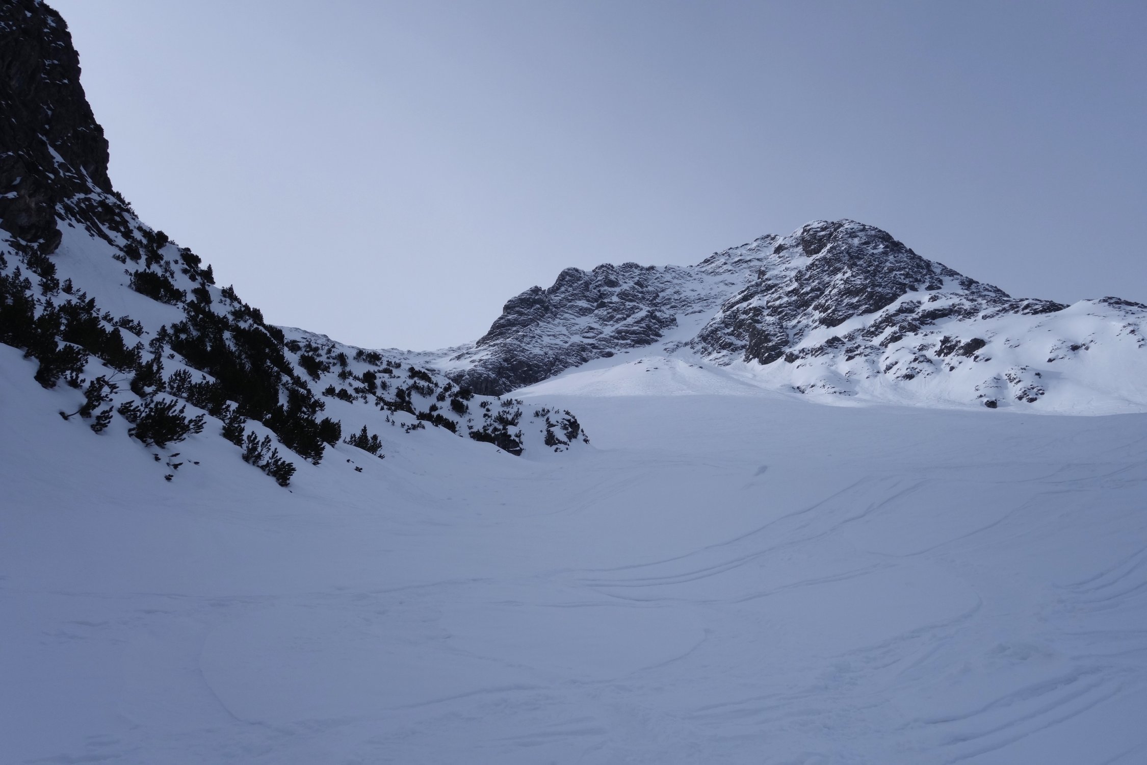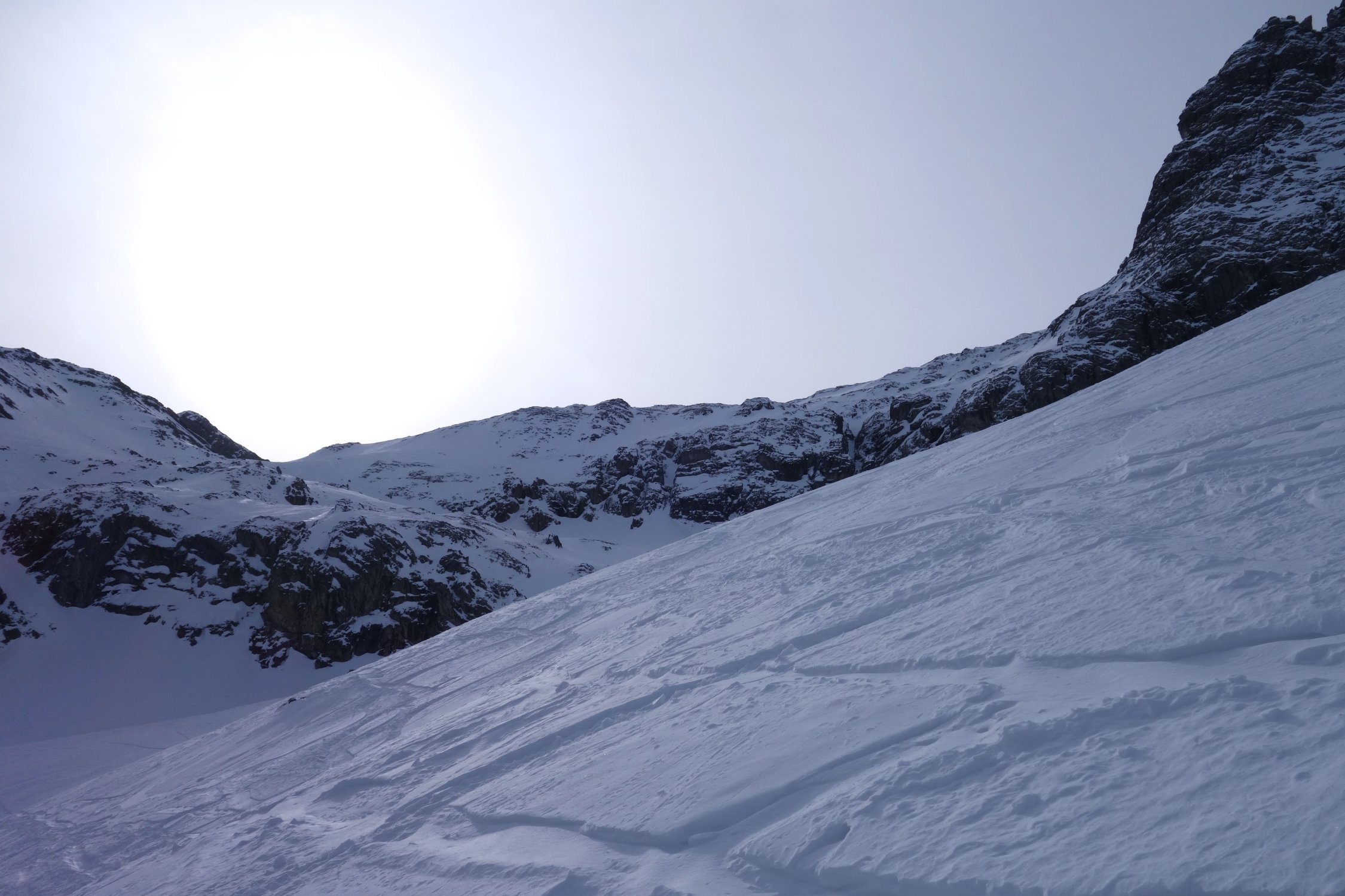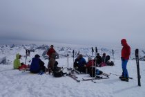 Gut gesetzter Schnee in Nordexposition. Leider nicht noch wenig Pulver. Aufstieg über die Steilstufe etwas mühsamer, weil der Hang recht verfahren ist. Danach einfaches und schönes Weitergehen mit Ski bis zum Gipfel.
