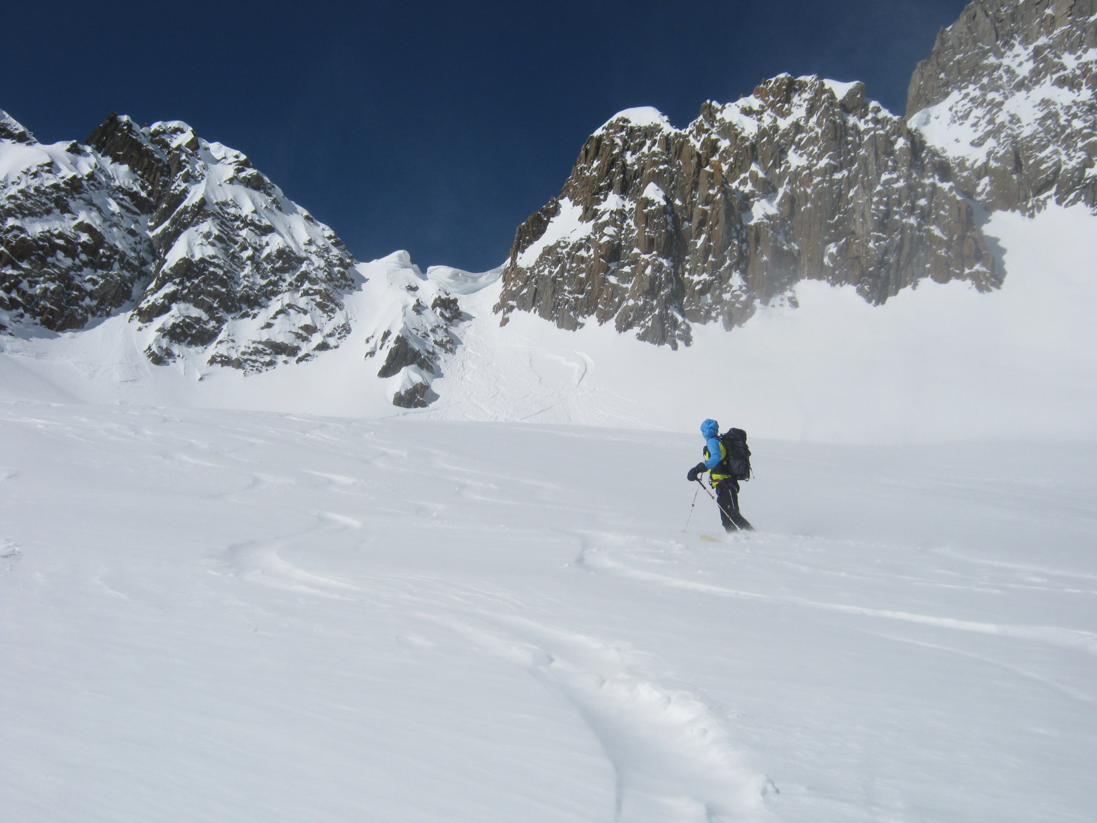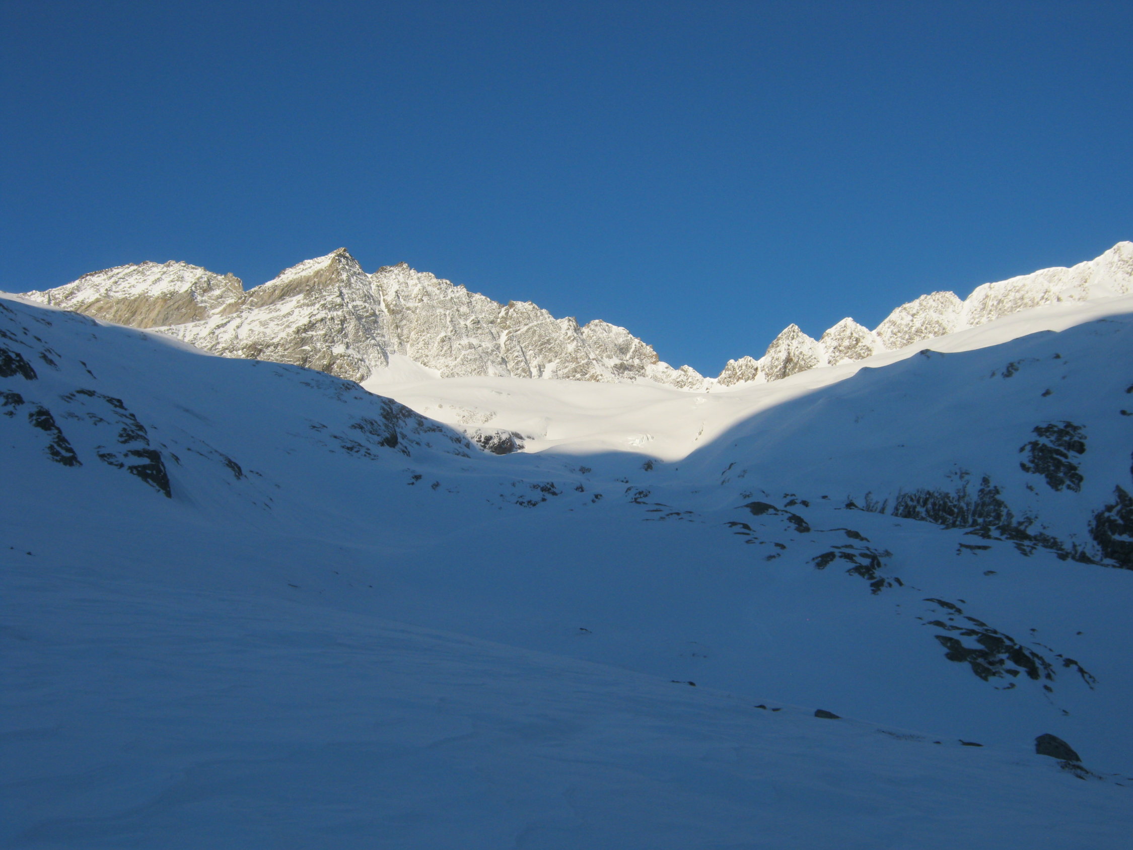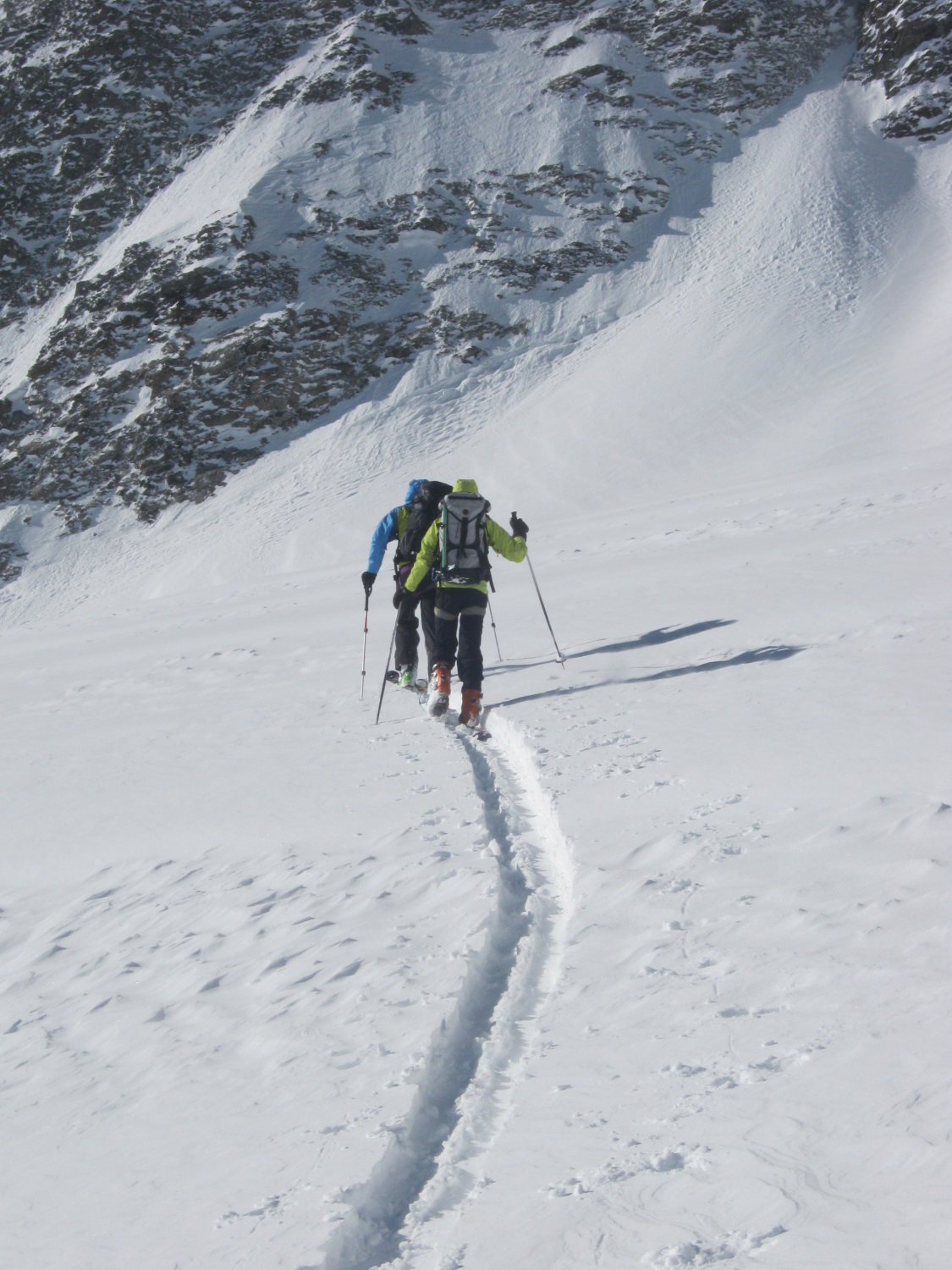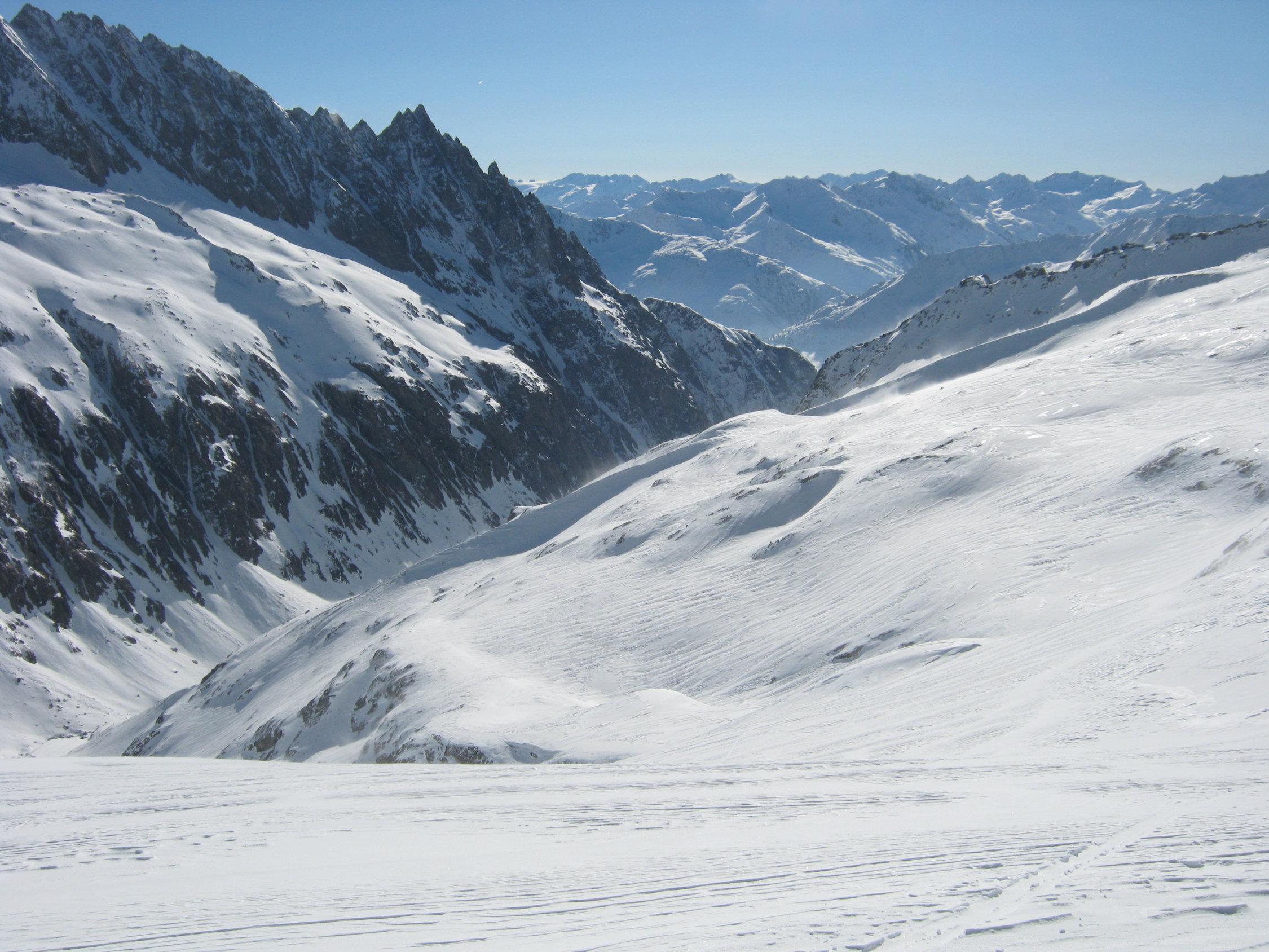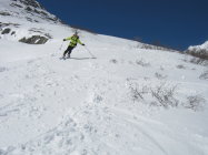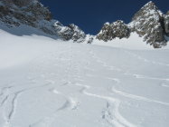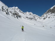 Der Wind hat in den beiden letzten Tagen ganze Arbeit geleistet. Viel windgepresster Pulverschnee zwischen Vorlaphütte und Chelenalplücke. Heute war es auf der ganzen Route sehr windig. Dieser N/NW-Wind hat im Couloir zur Chelenalplücke viel Triebschnee abgelagert. Eine Fahrerin einer Heli-Skiing-Gruppe (von der Sustenlimmi her kommend) hat beim Runterfahren ein kleines Schneebrett ausgelöst und war sehr erstaunt darüber, was da abging! Unterhalb der Chelenalplücke auf 3020 Meter sind wir umgekehrt. Sustenhorn ist ab Sustenlimmi windbearbeitet. Oben gab es ein paar tolle Pulverhänge, dann teilweise leicht verdeckelt. Unten im Voralptal bereits Sulzschnee.