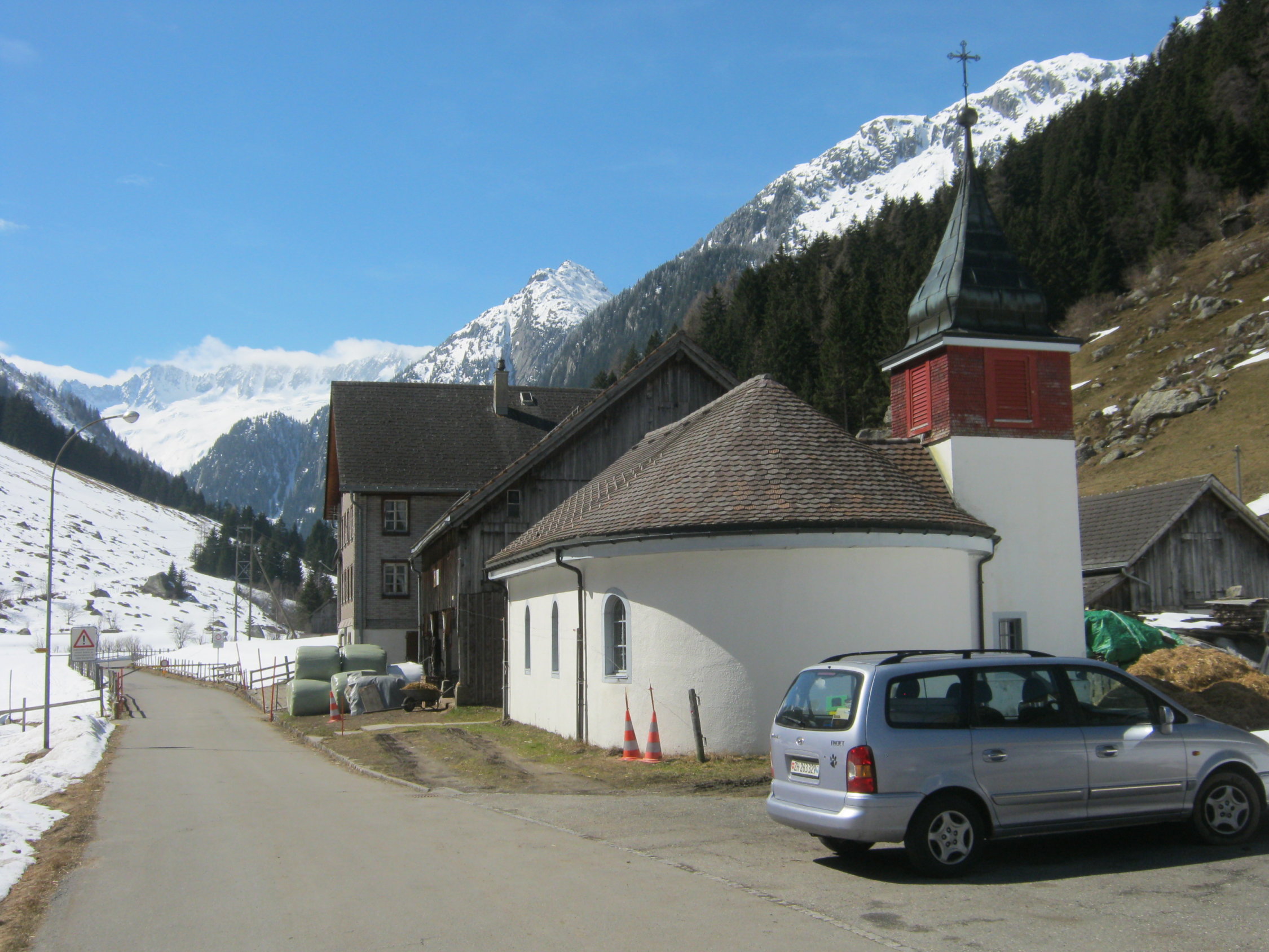 Die Strasse ab Abfrutt ist gesperrt und teilweise schneebedeckt. Am Rand kann man mit den Skis zu etwa 70-80% am Strassenrand fahren.