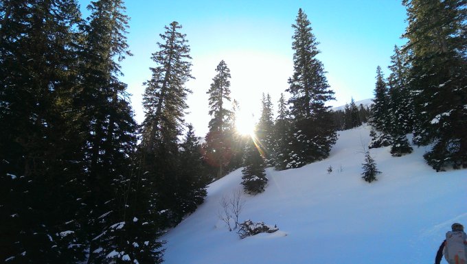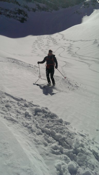Mit der tageszeitlichen Erwärmung sind einige Oberflächen-rutsche in sehr steilem Gelände abgegangen, aber bei richtiger Routenwahl stellten diese keine Probleme