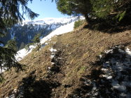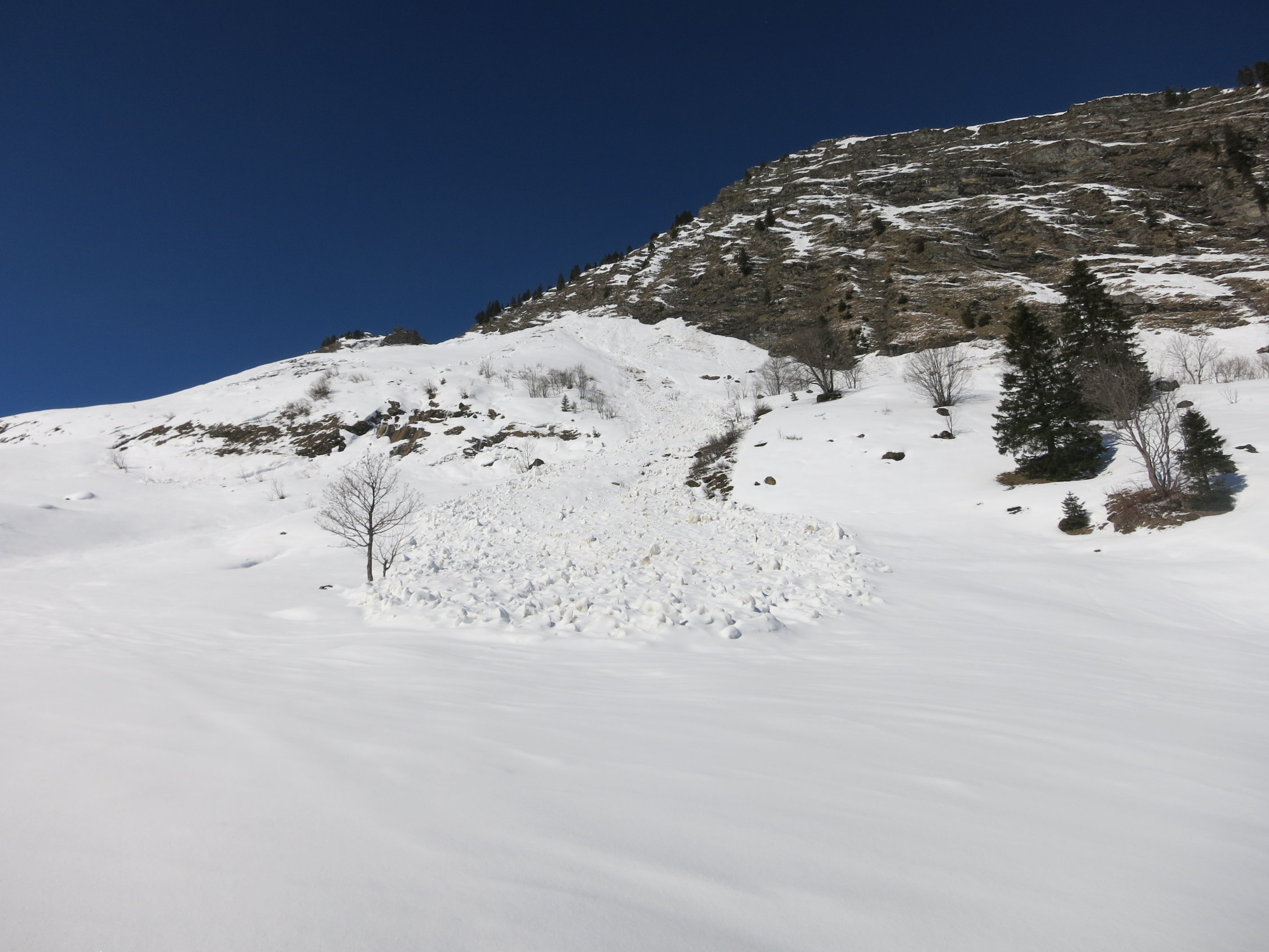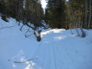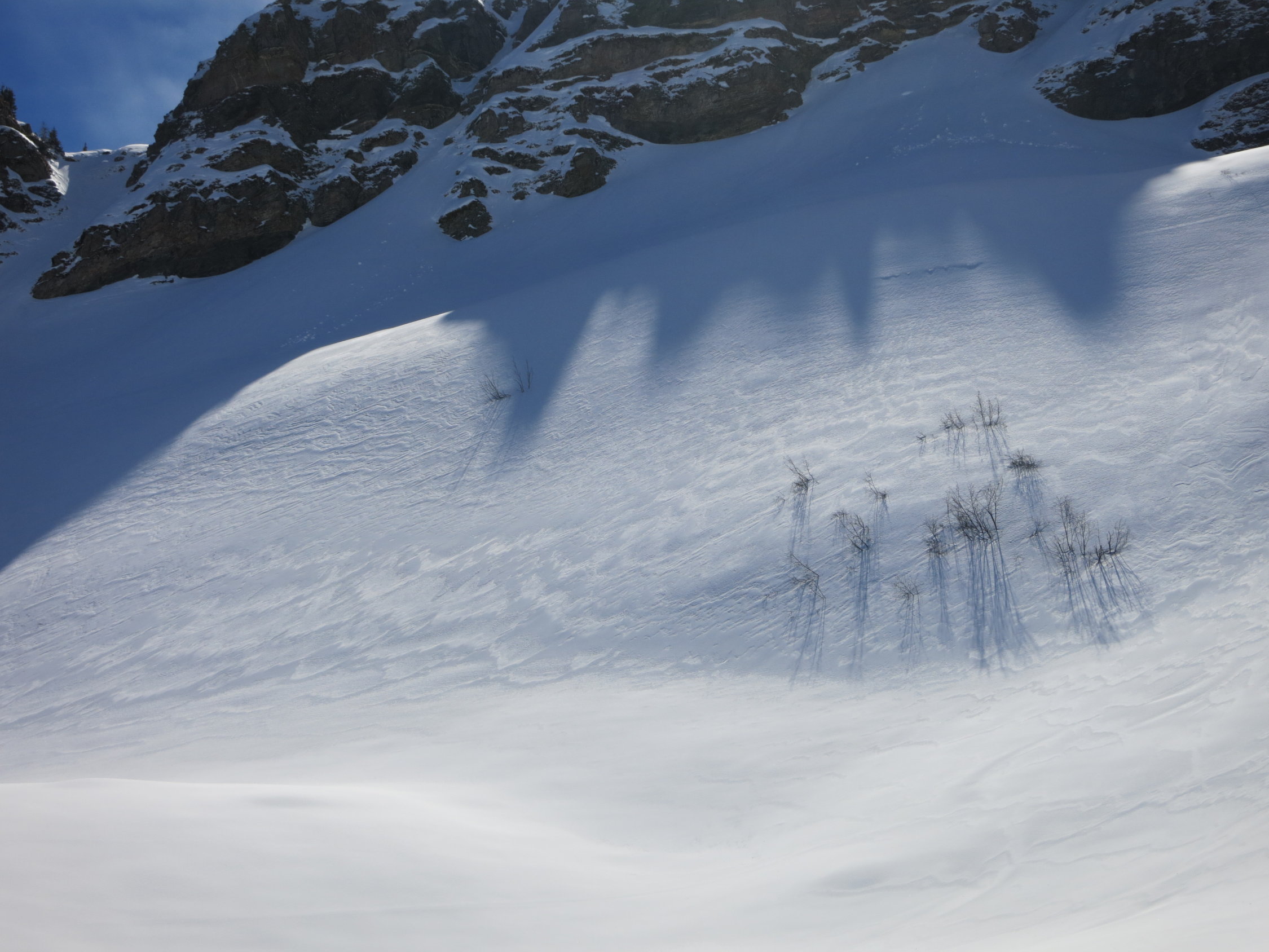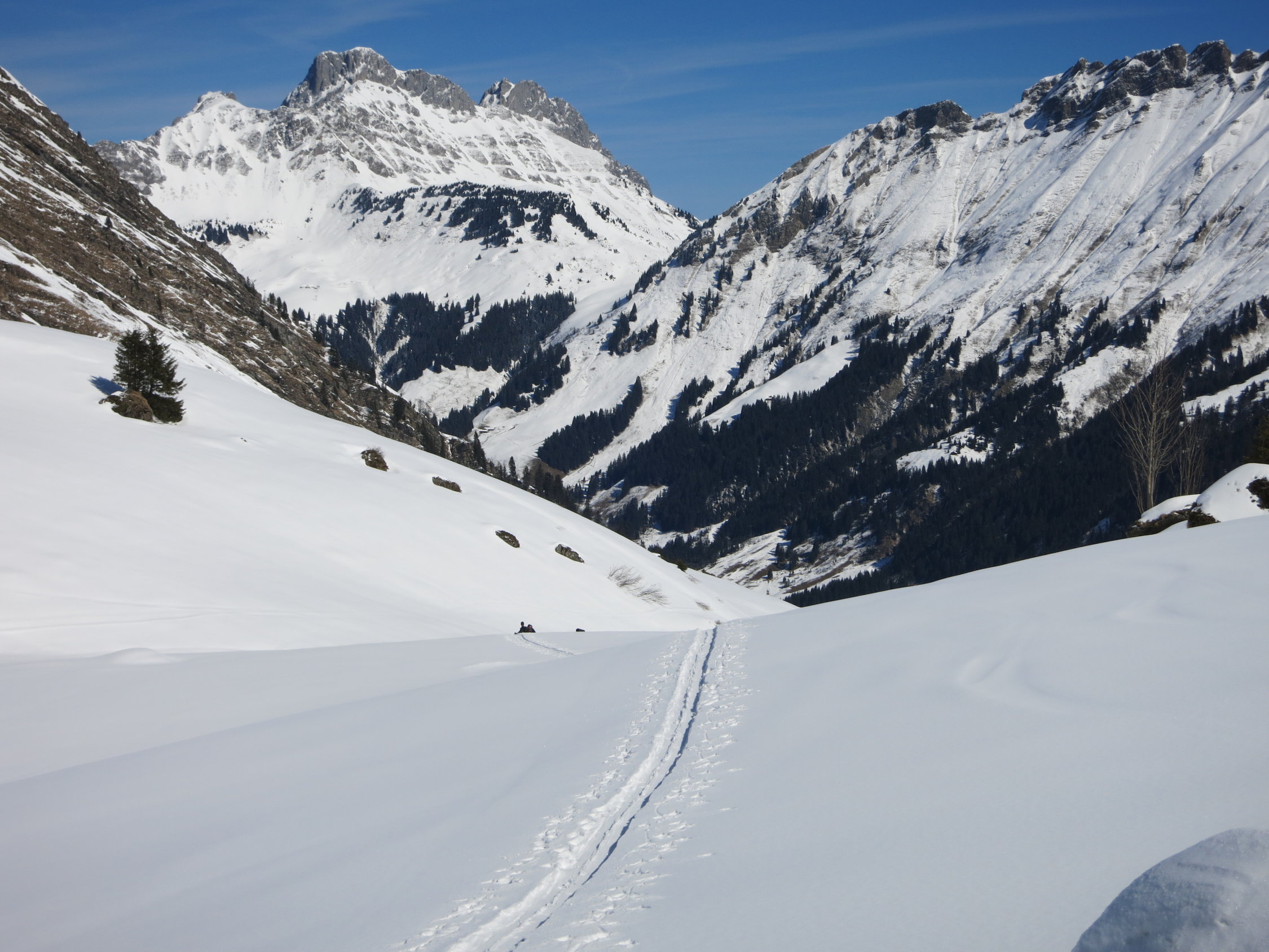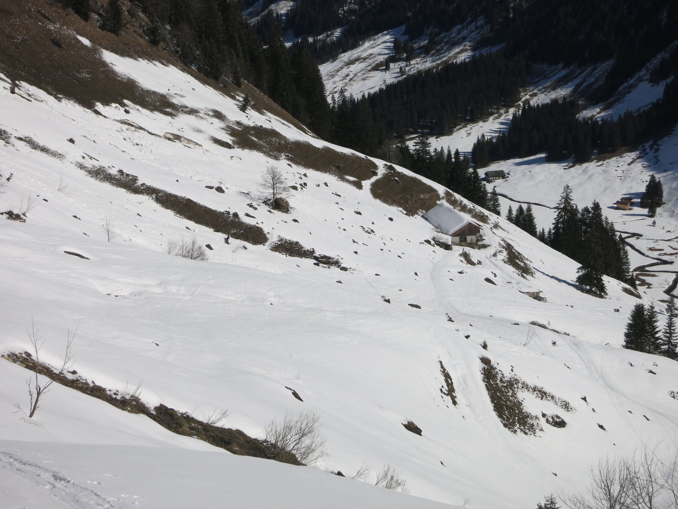 Am Bach entlang kurze apere Stellen. Ski können (noch) dranbleiben. Ansonsten top Verhältnisse mit Pulver oben, schweren Pulver unten und einigen aufgesulzten Hängen weiter unten. Noch wenig Spuren drin.