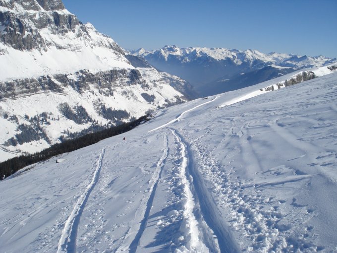 Abfahrt war bis Ober Sulzbalm ein Traum, weil es noch viele unerfahrene Hänge mit ordentlich Pulverschnee gab. Traverse zurück zum Fisetengrat ist wie immer ein heikles Unterfangen, da auf den Kuppen Steinkontakt fast nicht vermieden werden konnte. Abfahrt vom Fisetengrat ausserhalb der Wildruhezone war sensationell, weil weitgehend unerfahren und mit schönem Pulver belegt.