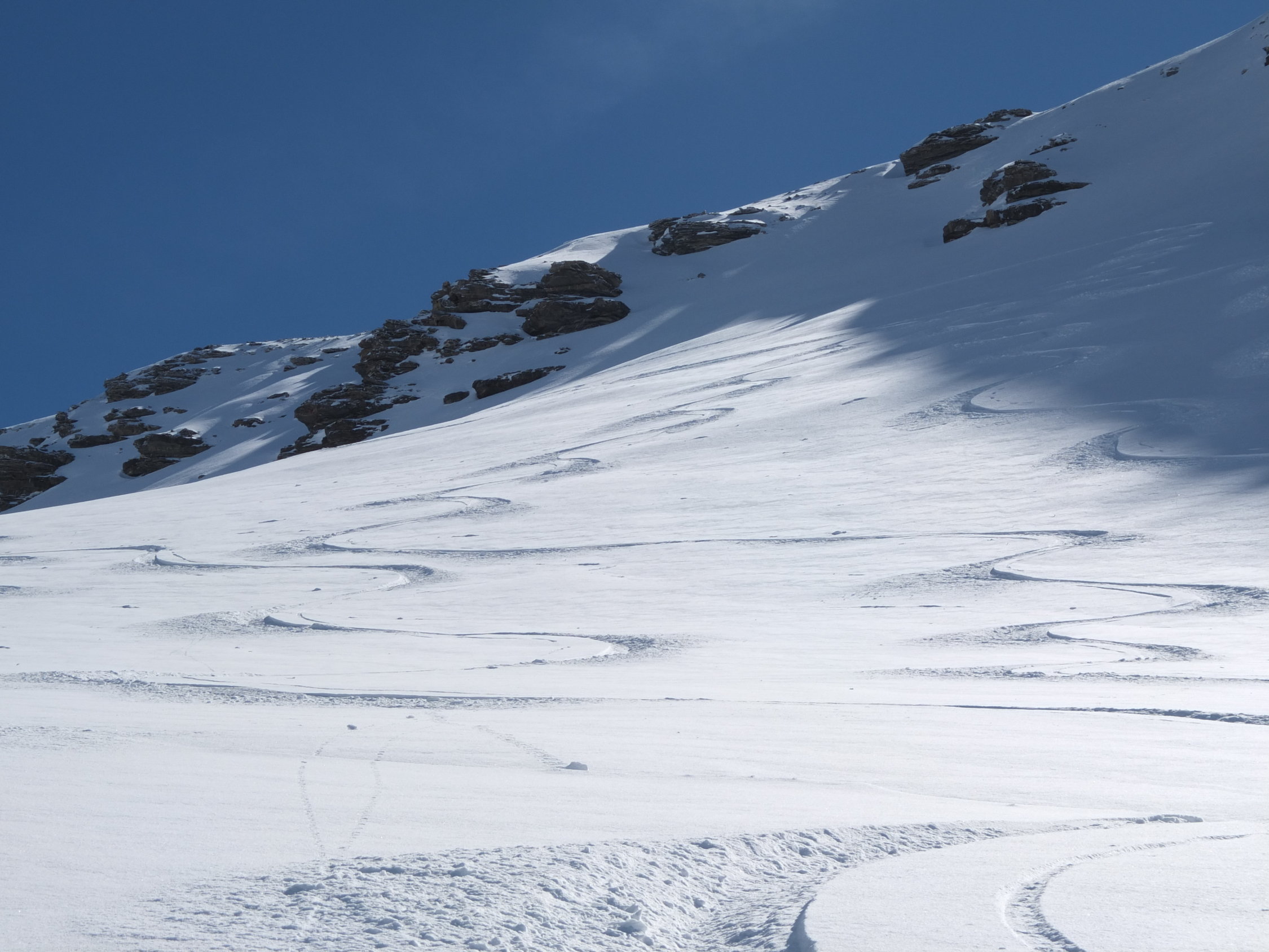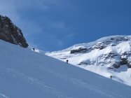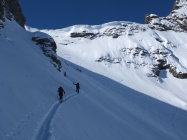 So super Verhältnisse für die Abfahrt. Bis zum Sattel 20 cm Pulverschnee vom feinsten. Auch unten hat der Schnee sehr gut nachgegeben, obwohl er ganz leicht gedeckelt und teils verfahren war. Hochgehen war im oberen Drittel vor der Wächte eher schwierig, weil der Schnee sehr körnig war. Man ist häufig abgerutscht. Am Schluss kurz vor dem Ausstieg die Skier getragen.