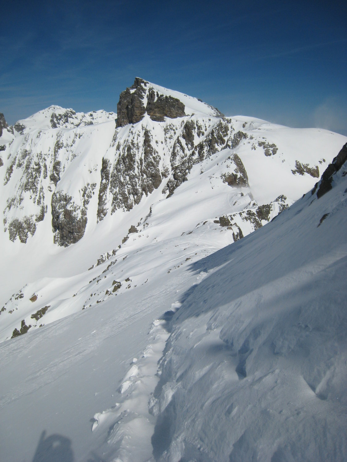 Wald bis Rieter im Aufstieg gangbar, runterfahren absolut nicht zu empfehlen. Sehr schöne Spur von Sewenstöss auf Sewenzwächten angelegt gewesen (wohl Makulatur bei dem angesagten Wetterwechsel). Fußaufstieg auf Gipfel problemlos (Steigeisen nicht unbedingt notwendig). Gratüberschreitung ebenfalls schön eingespurt, "Wächtensprung" auf Bächenfirn heute nicht vorhanden, konnte wunderbar linkerhand bei Abseil-Reepschnur (Foto) umgangen werden. Weiteraufstieg auf Zwächten hart, Harscheisen kein Luxus. Insgesamt viel Neuschnee (von Auto 3cm bis oben ca. 30cm) und sehr starker Wind bzw. Windverfrachtung, teils unangenehme Sturmböen mitsamt Gesichtspeeling. Abfahrt Rossfirn über Rossbiel und Rossplangg ins Chlialptal von oben nach unten: windgepresster Pulver, super (viel) Pulver, Pulverauflage, schwerer Pulver, Nassschnee hin zu Faulschnee im Tal! Und dann fast schon die Sustenpassstrasse bergab stöckeln, weil es so arg bremst.