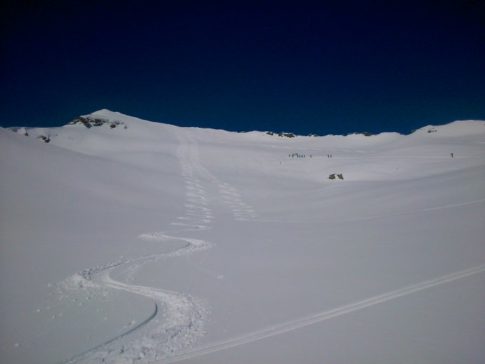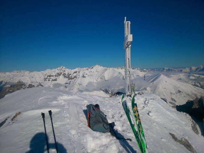 In jeder Hinsicht Topverhältnisse. Unten ein paar kurze Tragestellen auf dem Alpweg. Schnee gut tragend, zeitweise mit Pulvereinlage. Ab Vazer Alp dann zunehmend eingeblasener Pulver, im Gipfelhang top. Herrliches, weitsichtiges Wetter und richtig angenehm warm. Wenig Wind am Gipfel.