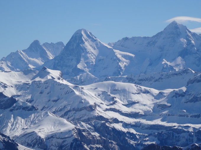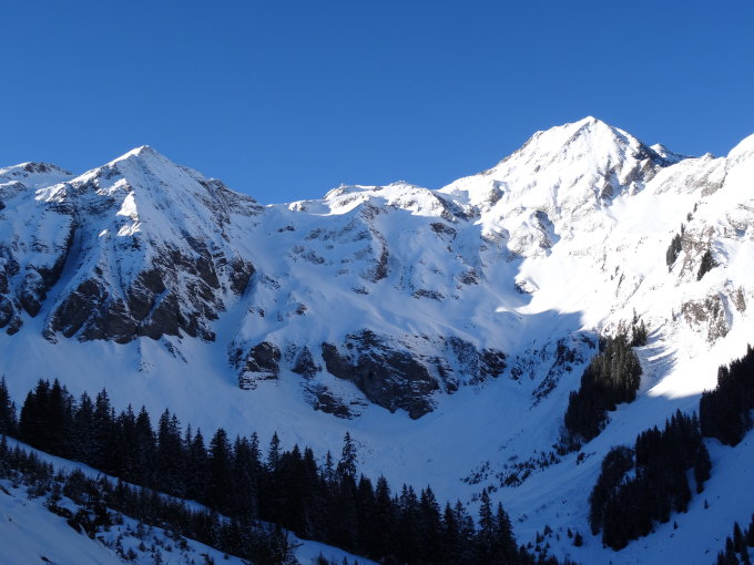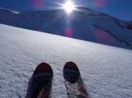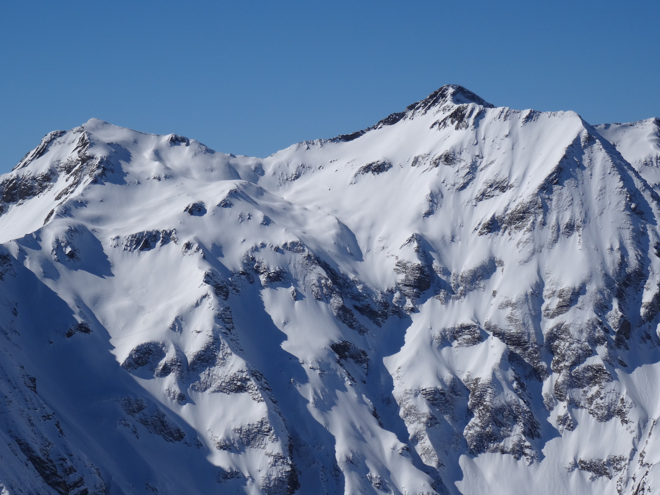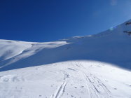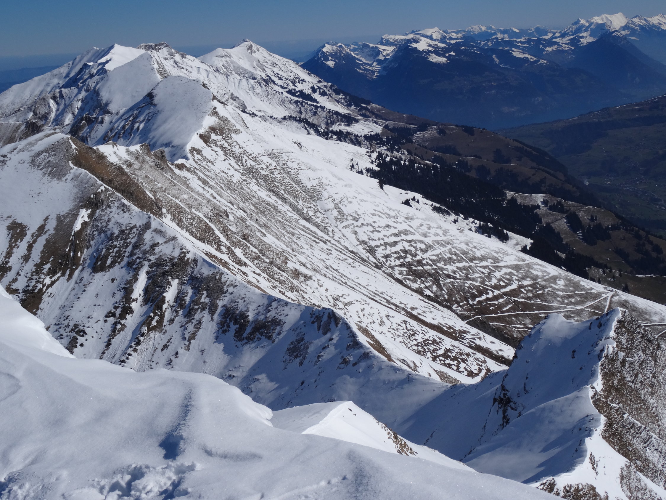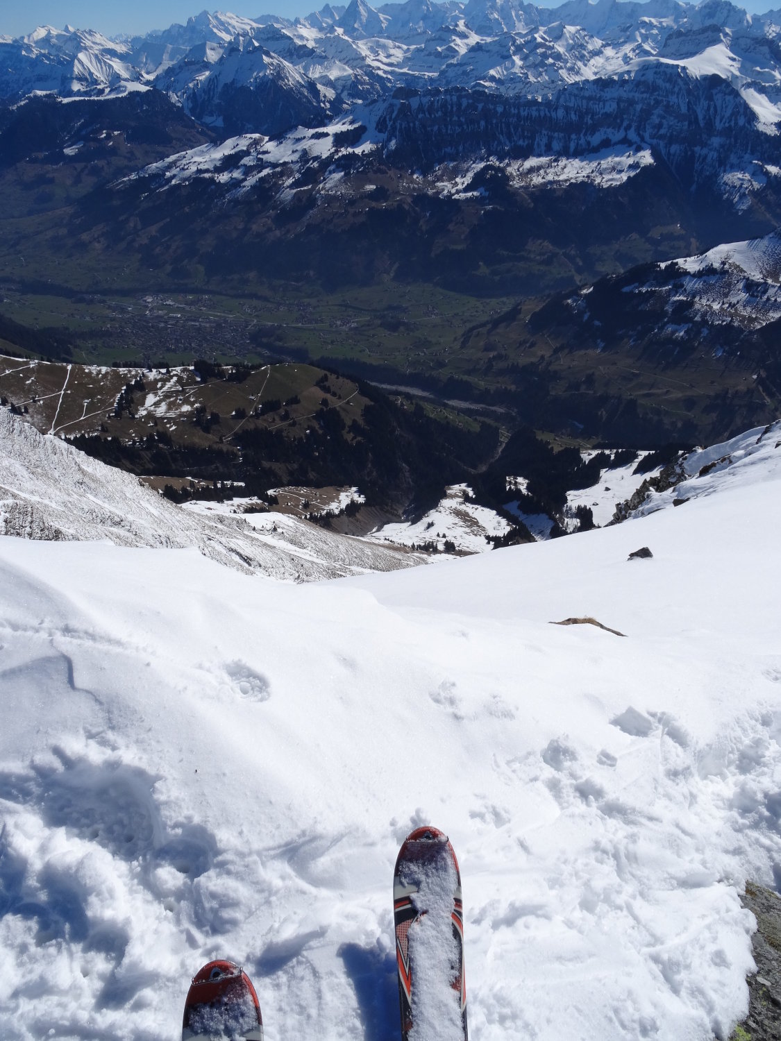 Aufstieg ab Alp Hohniesen ohne Harscheisen machbar, da 5 cm relativ verfestigter Neuschnee auf harter Unterlage.