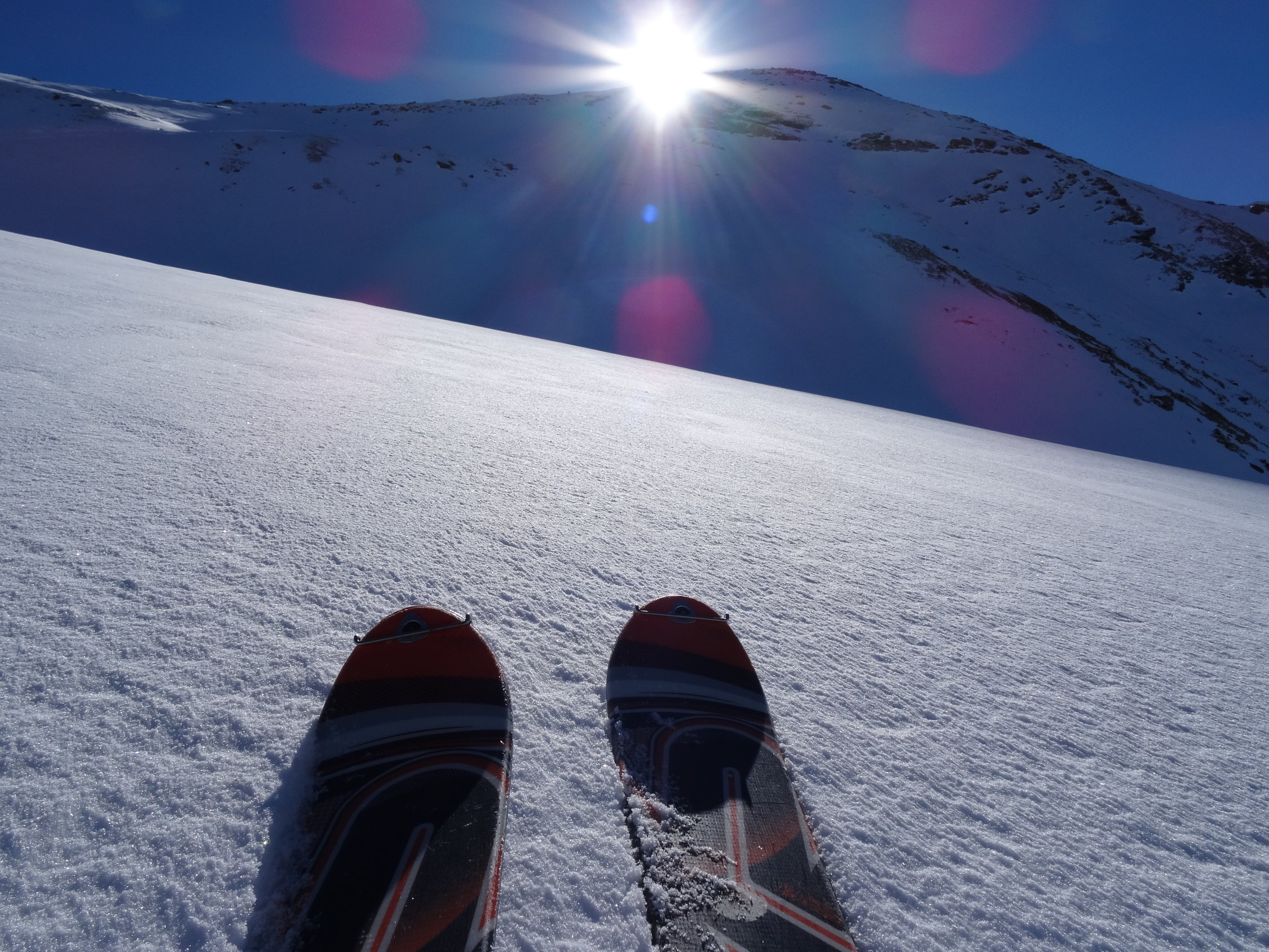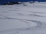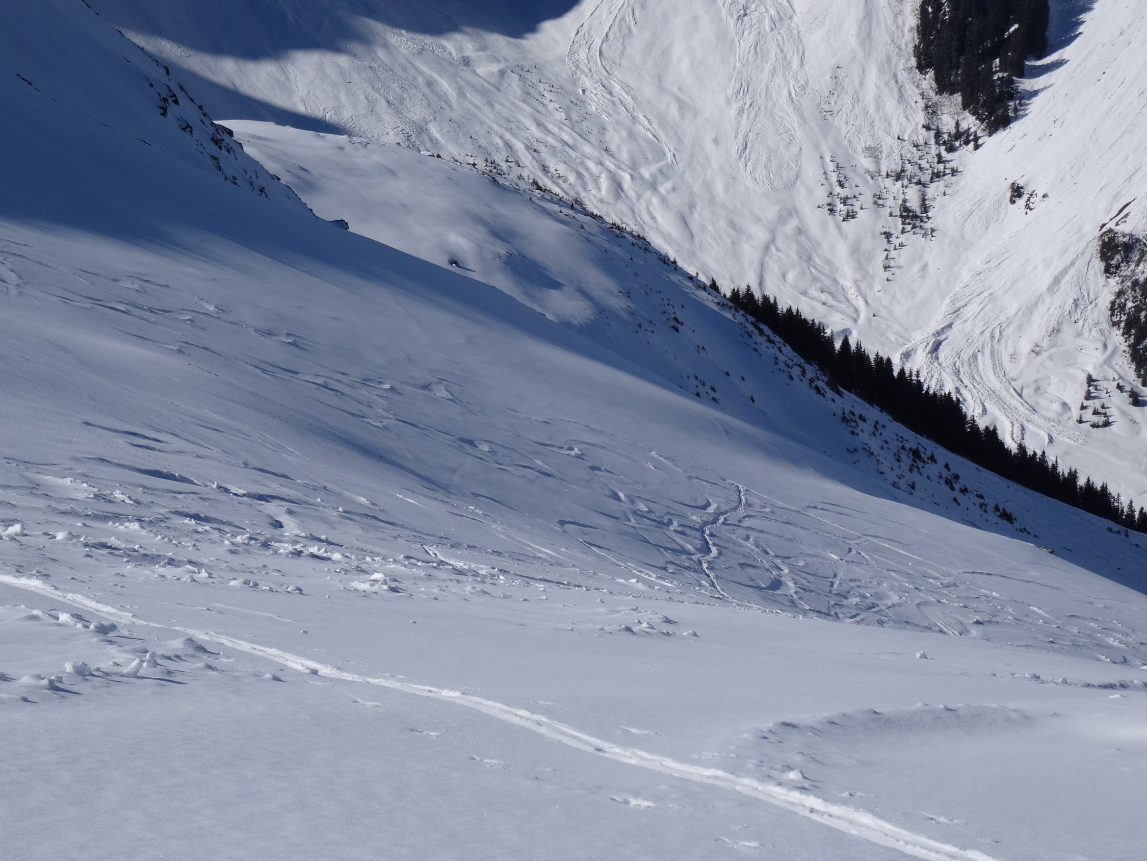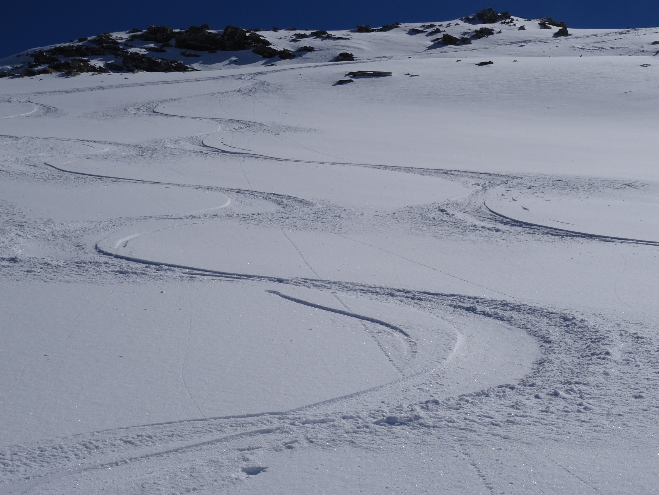 Abfahrt um 10:45 über Gipfelhang war traumhaft. Nicht aufgesulzt aber die wenigen cm Neuschnee waren griffig ohne Deckel – siehe Fotos.