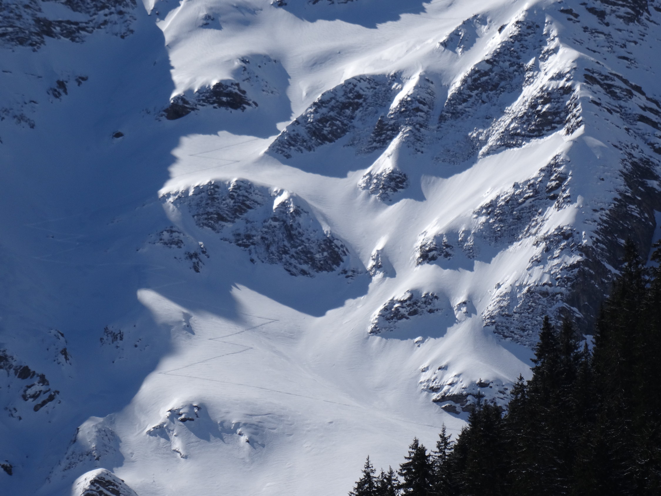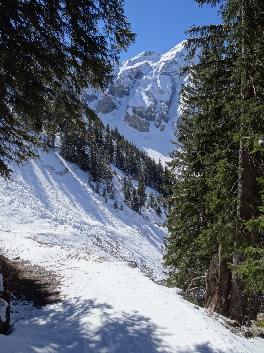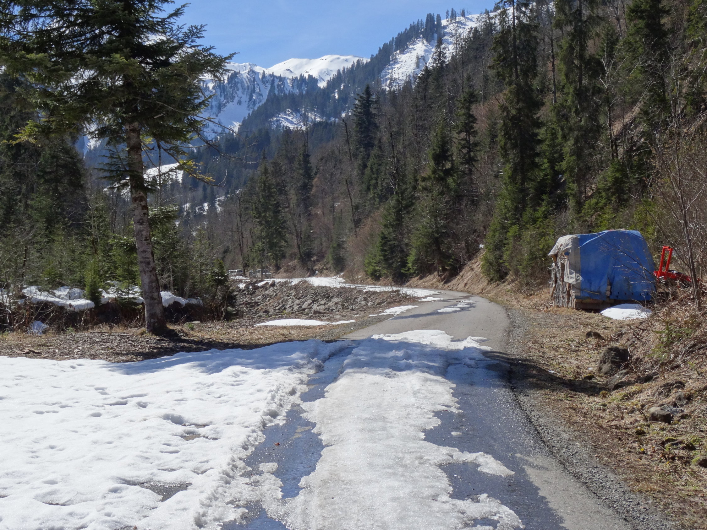Es liegt nicht mehr viel Schnee auf der Strasse in den Chirel. Parkiert kurz nach Parkplatz Siterebrügg hinter Säge. Von dort mit Strasse mit Ausnahme von 3 kurzen apern Stellen noch knapp schneebedeckt. Ab Erbs Chirel den Hängen folgend in die unterste Haarnadelkurve des Alp Weges auf ca. 1540m war nicht lohnend da die Hänge zum Teil aper waren – besser der Strasse / Alp Weg folgen.