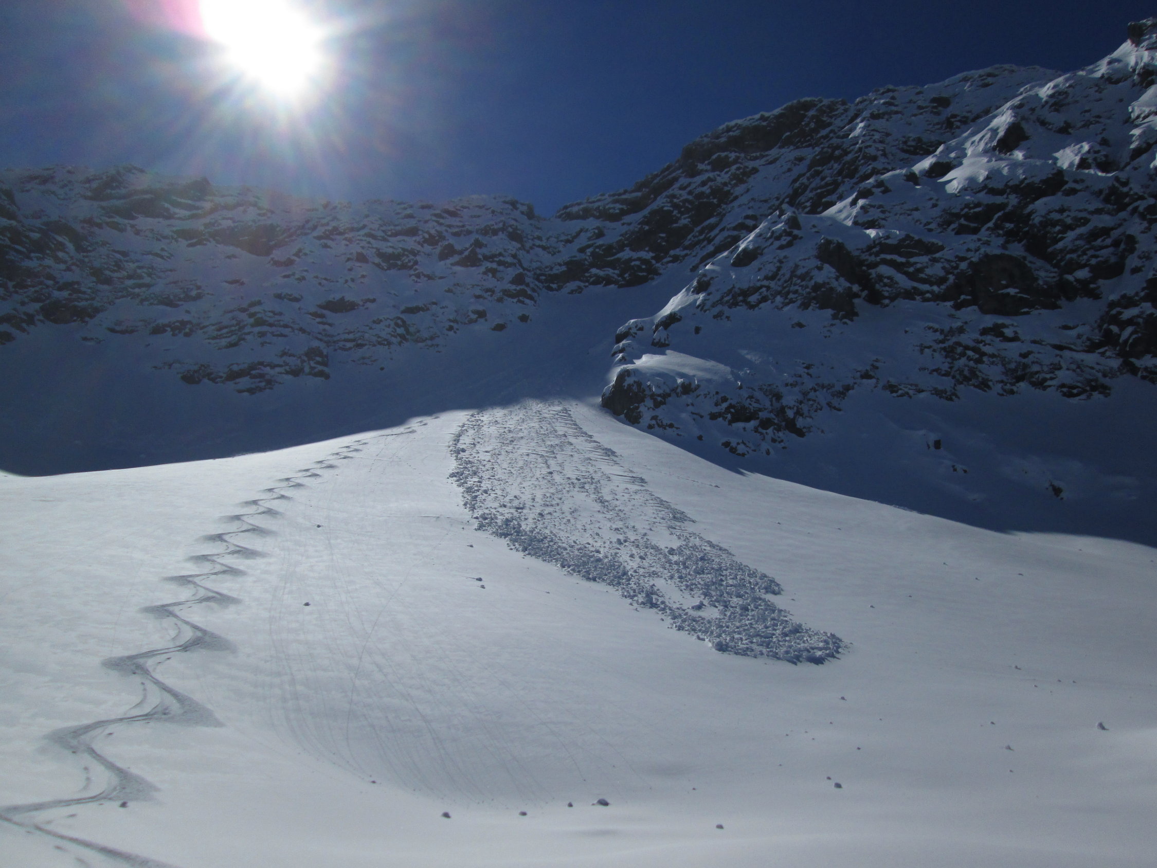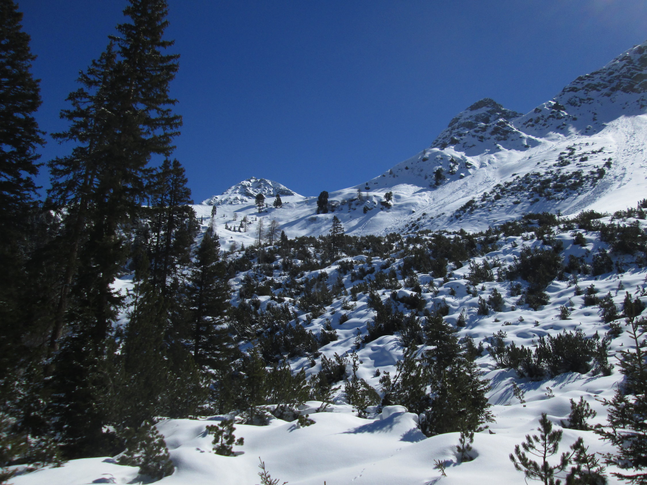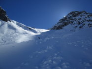 Genug Schnee im Gebiet. 5-15cm Pulver auf harter Unterlage, vom Stausee bis zum Gipfel. Die kleinen Triebschneetaschen kommen bei Belastung schnell ins Rutschen. Alte Aufstiegsspur immernoch sichtbar. Ganz allein im Gebiet.