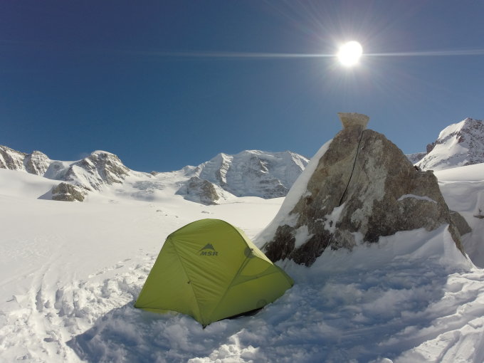 Wir sind von Morteratsch nicht zur Bovalhütte aufgestiegen, sondern der Piste entlang Richtung Diavolezza und haben etwas abseits auf ca 2750m unser Zelt aufgeschlagen. Am nächsten Tag (mit gefühlt 100 anderen Tourengängern) dann über den Normalweg auf den Palü-Ostgipfel. Das Durchqueren der zwei großen Seraczonen ist im Moment noch problemlos, wenn keine Spur liegt aber sicher nicht trivial! Es war sehr windig (>50kmh), sodass sich alle Seilschaften (inklusive uns) gegen den Verbindungsgrat zum Hauptgipfel entschieden haben. Der Ostgipfel ist gegen den Nordwind aber abgeschirmt, sodass es sich dort gut für eine Weile aushalten lässt. In der Abfahrt oben schöner Presspulver, unten (ab der Morteratschabfahrt) Buckelpiste.