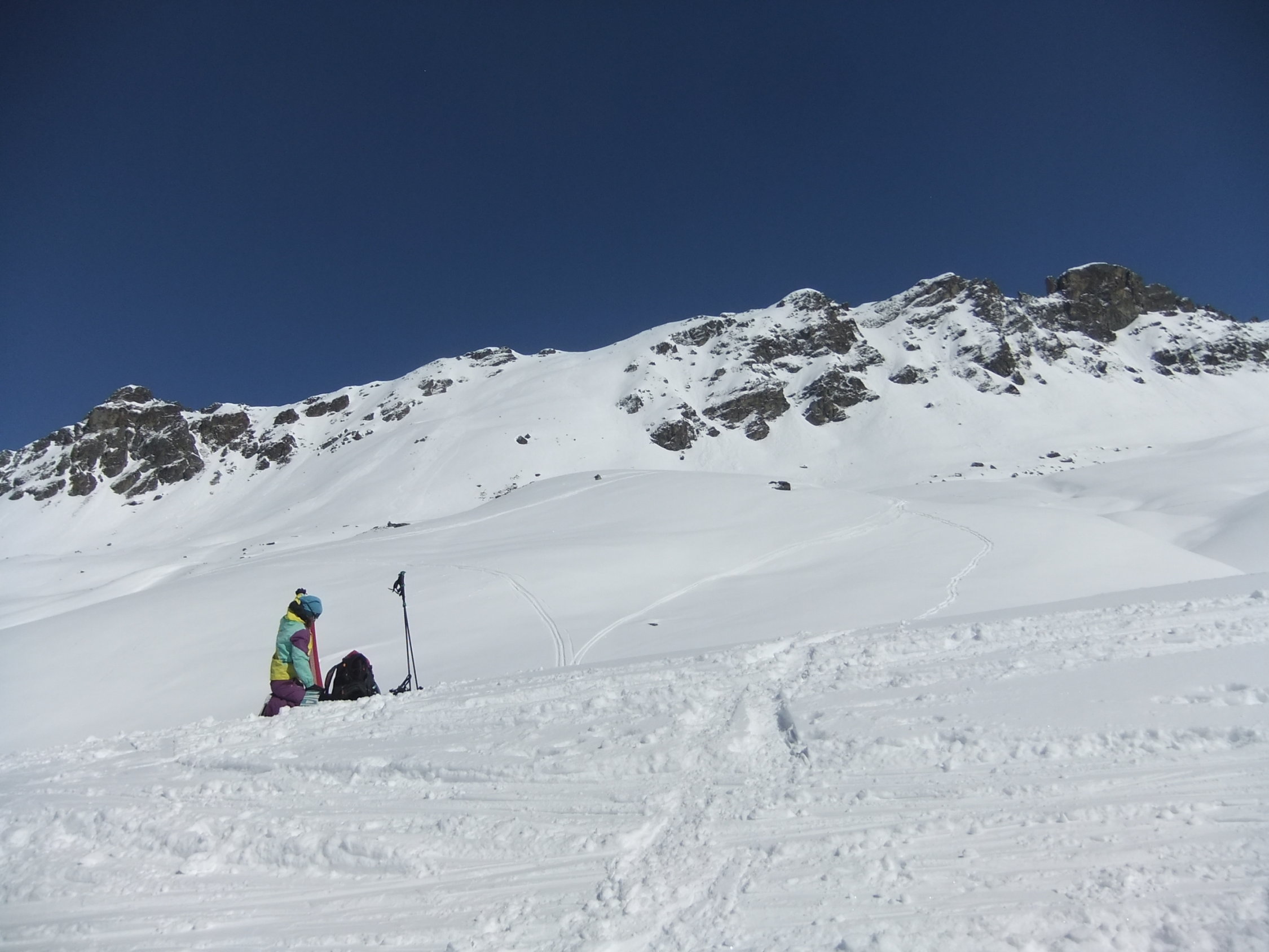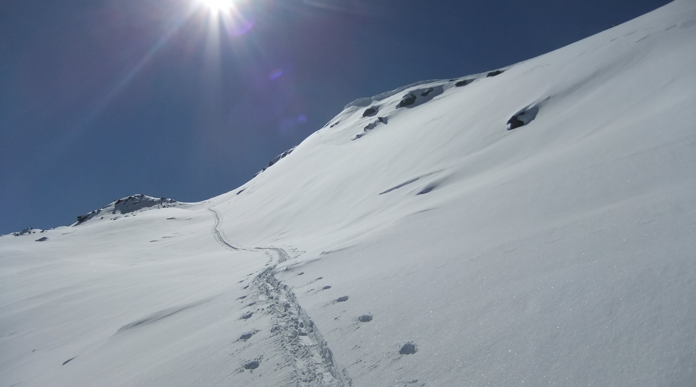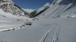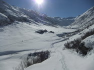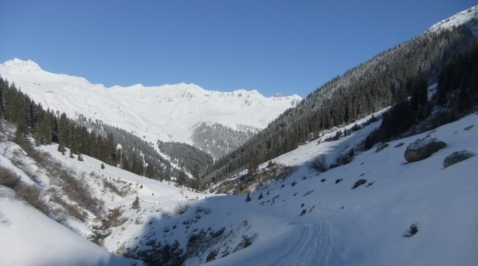 Der Aufstieg über die Nordseite des Bergs ist nicht so steil wie von der Südseite. Darum führt die „klassische“ Skitour-Route dort hinauf. Vormittags befindet sich das Vergaldner Tal bereits in der Sonne, im Gegensatz zum Wintertal.