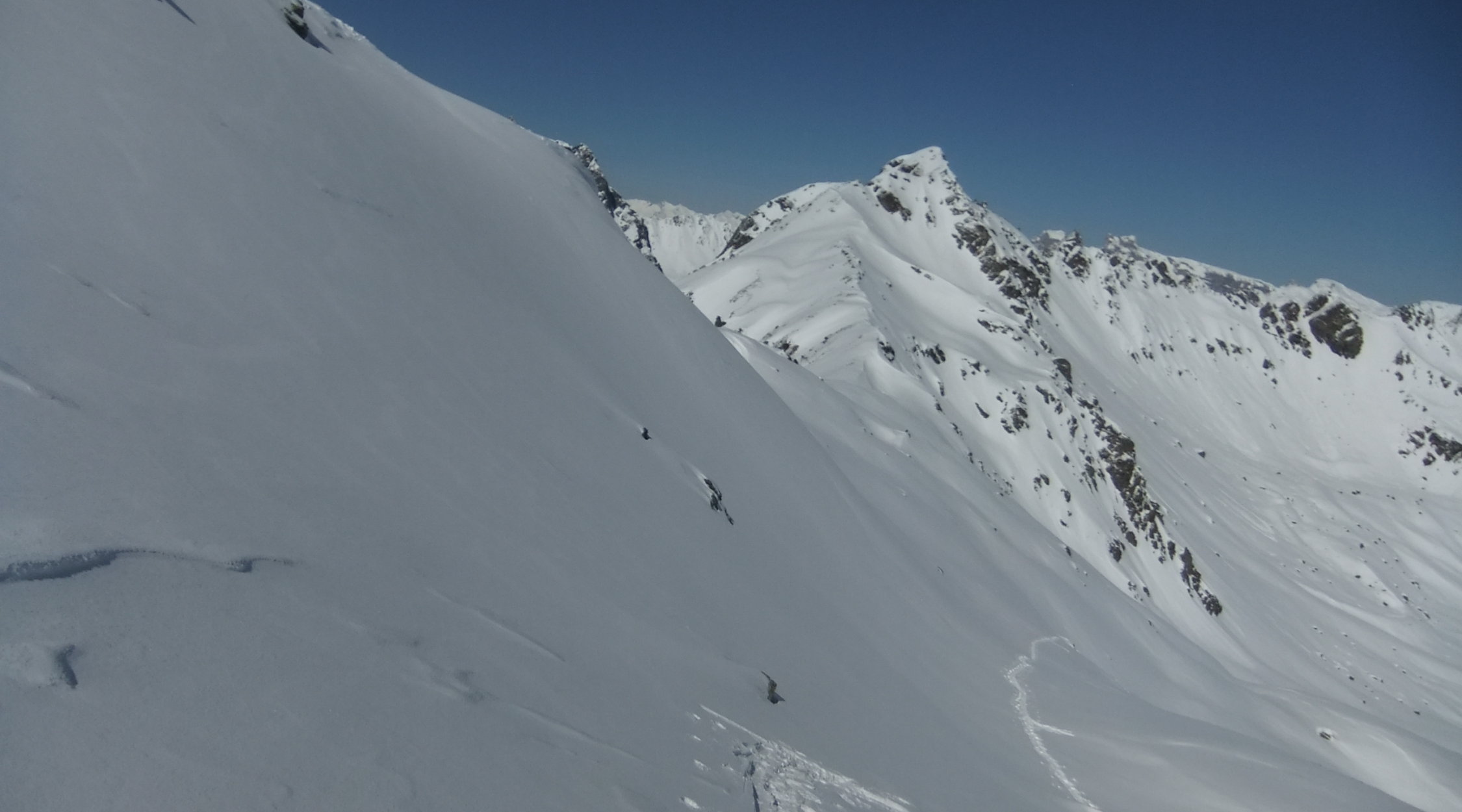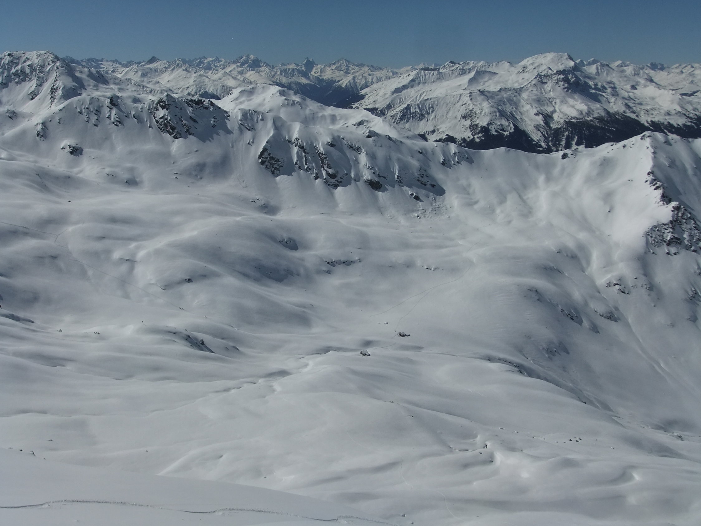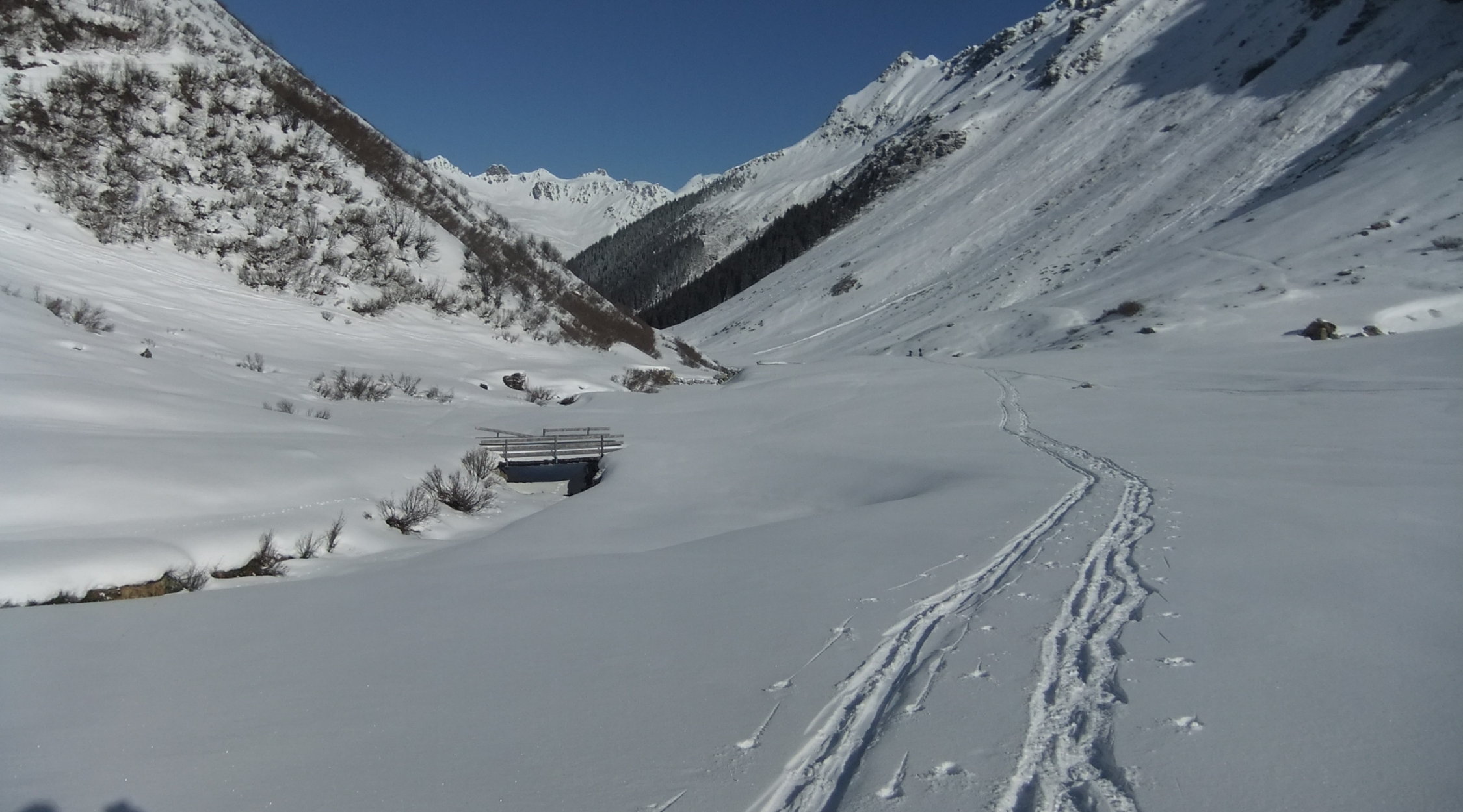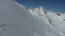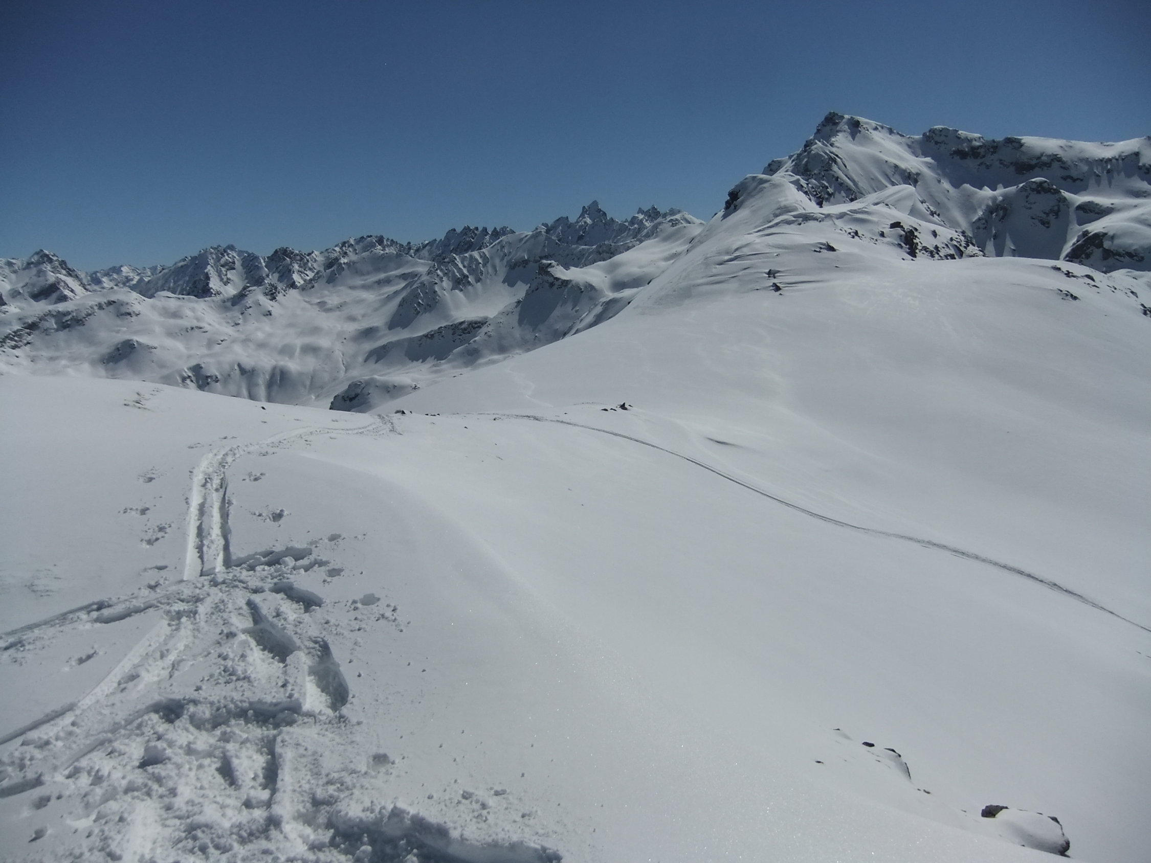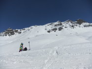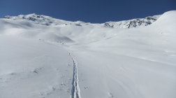 Im Aufstieg spurte ich anfangs, bis mich im unteren Drittel ein Skitourengänger überholte. Nach mir stiegen noch über 20 auf. Im Vergaldner Tal stiegen 2 Gruppen zum Heimbühljöchli hoch, andere Richtung Rotbühelhütte. Im Wintertal waren über 100 Skitürler unterwegs zum Rotbüelspitz, Paschianichopf, Schlappiner Grat, oder ins Gandatal.