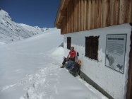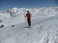 Nach den Niederschlägen in letzten beiden Tagen im Tal ca. 5 cm Neuschnee, in oberen Hängen bis zu 15 cm. Tourenbeginn um 07:30 Uhr bei -3°C und Bilderbuchwetter.