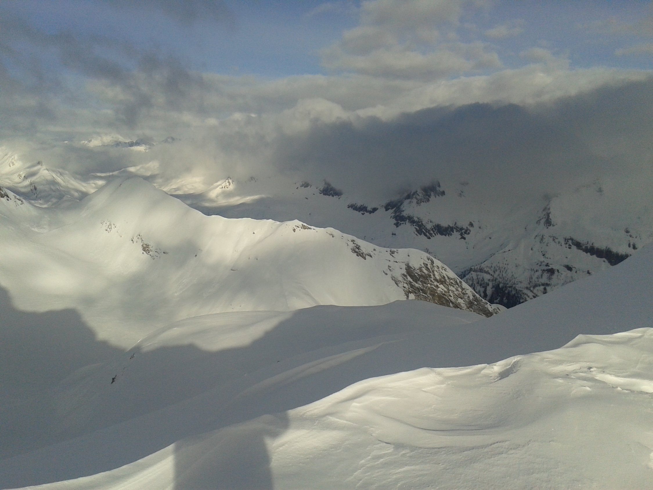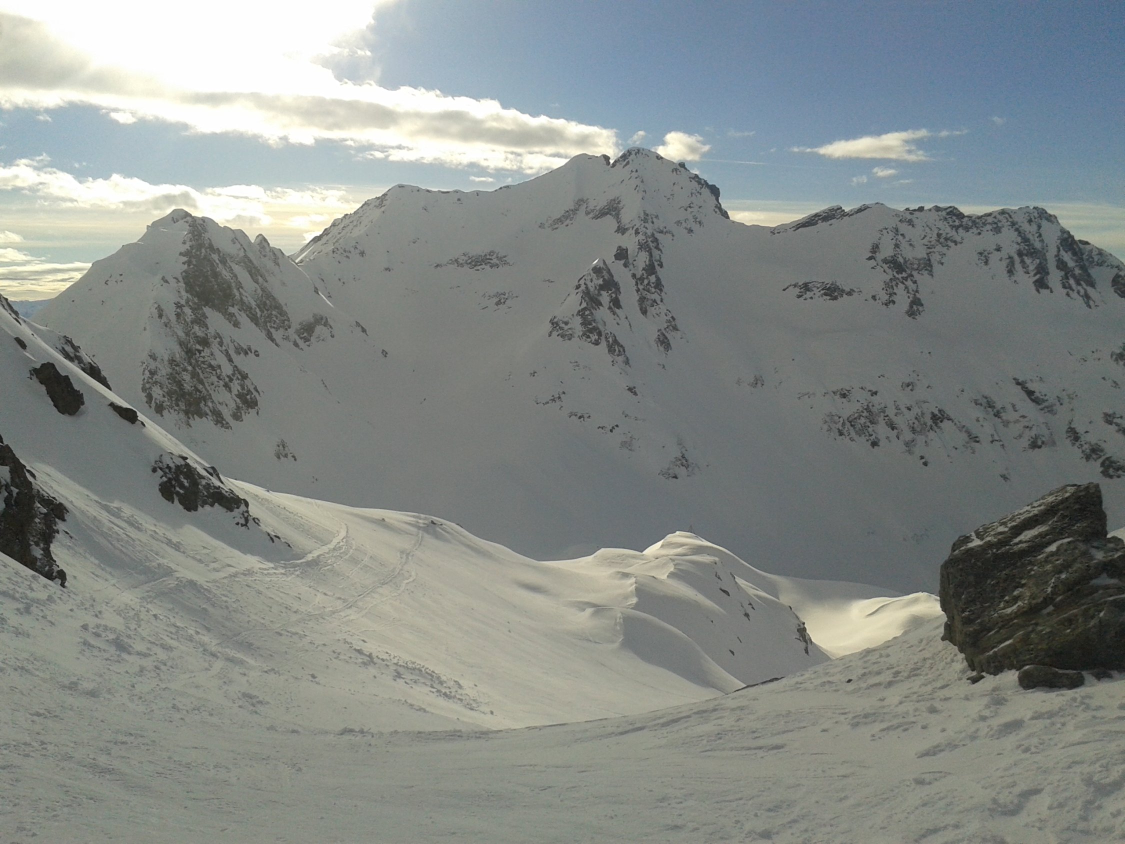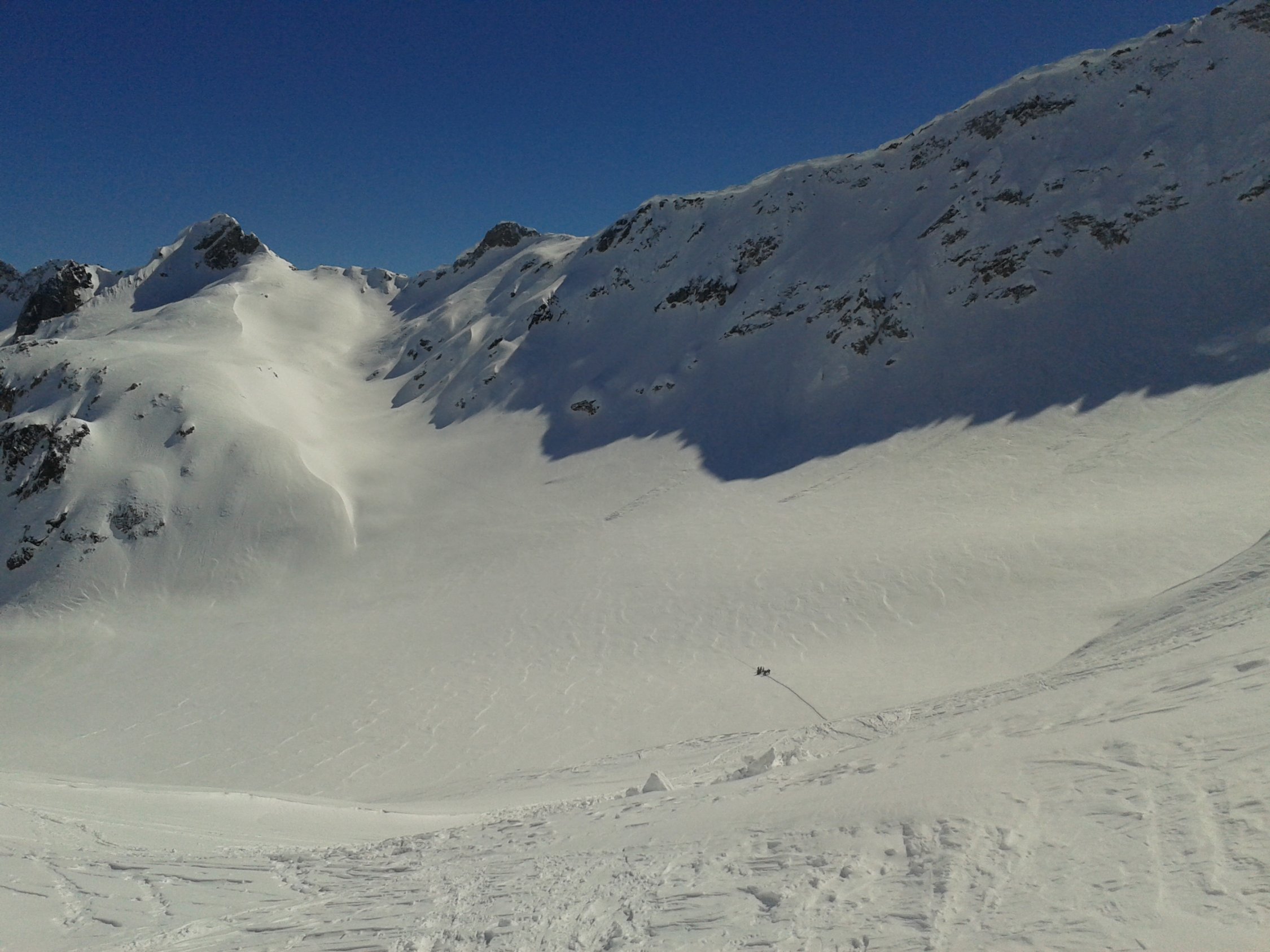 Wir sind das Val Cavagnolo am Samstag hoch und auf den Cristallina, am Sonntag dann Abfahrt über das Val Cavagnolo nach All'Aqua. Am Cristallina ist der Schnee windverpresst, aber der Aufstieg noch gut zu machen, wer will, kommt mit den Skiern sogar bis zum Gipfel. In der Nordwestabfahrt vom Cristallina noch Pulverreste, ansonsten überwiegend Harschdeckel bis All'Aqua, mittags unten Sulz.