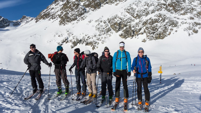 Auf der langen Traverse von der Jenatschhütte bis Punkt 2663 waren aufgrund des steilen Geländes und des gefrorenen Schnees Harscheisen nötig (Absturzgefahr). Wir sind bis zum Skidepot aufgestiegen und haben den Gipfel ausgelassen da dieser heute ohne Steigeisen zu heikel war.