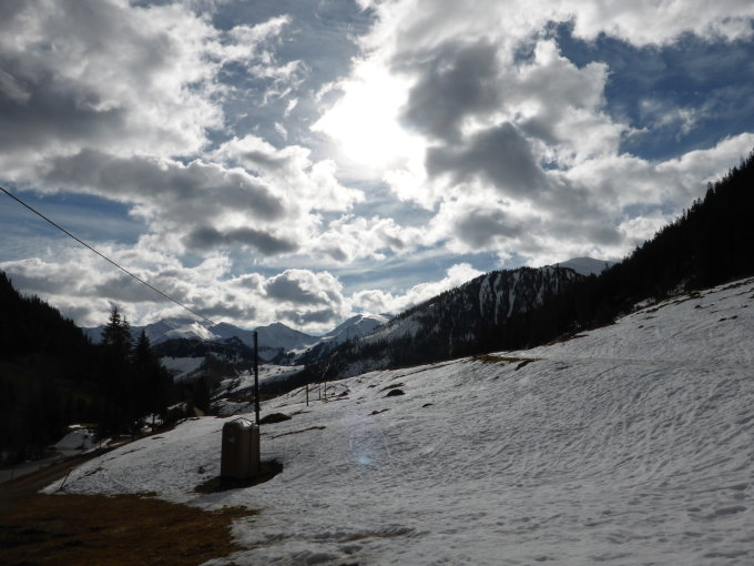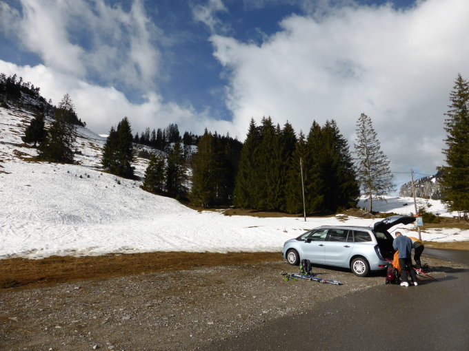 Schnee: auch hier noch erstaunlich gute Bedingungen ab Gipfel bis 1437m, danach über die Strasse(mit einer kleinen ca.6m Tragstrecke) bis neben das Auto beim Parkplatz 1259m. Kein Steinkontakt.