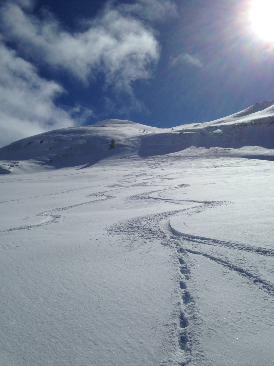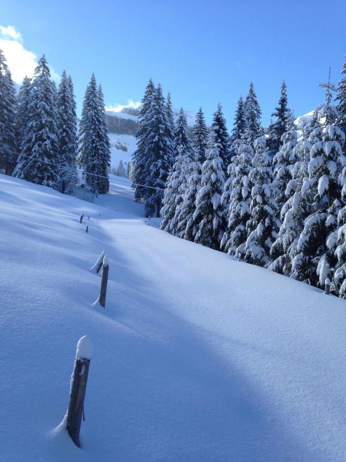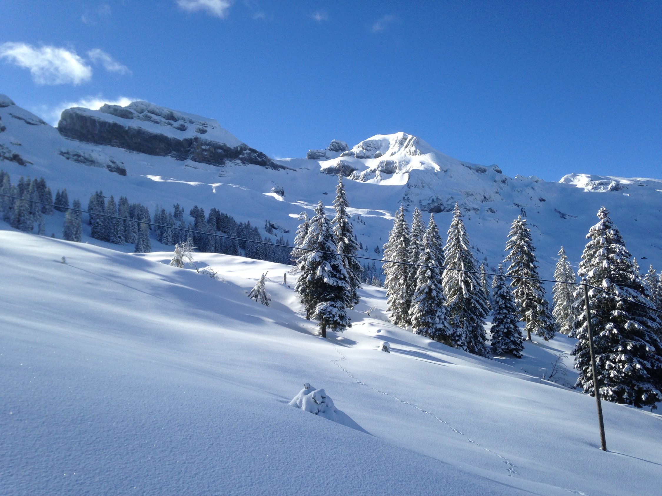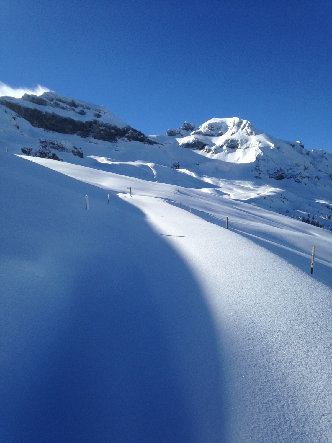 Sehr schöne Verhältnisse fast wie im Hochwinter. Bei Weglosen der Waldweg noch sehr gut eingeschneit. Unterhalb der Drusberghütte schöner Pulver (wird wohl am Nachmittag nicht mehr so sein...). Oberhalb Drusberg ebenfalls Pulver, teilweise jedoch verblasen bis blank auf verharrschter aber fester Oberfläche.