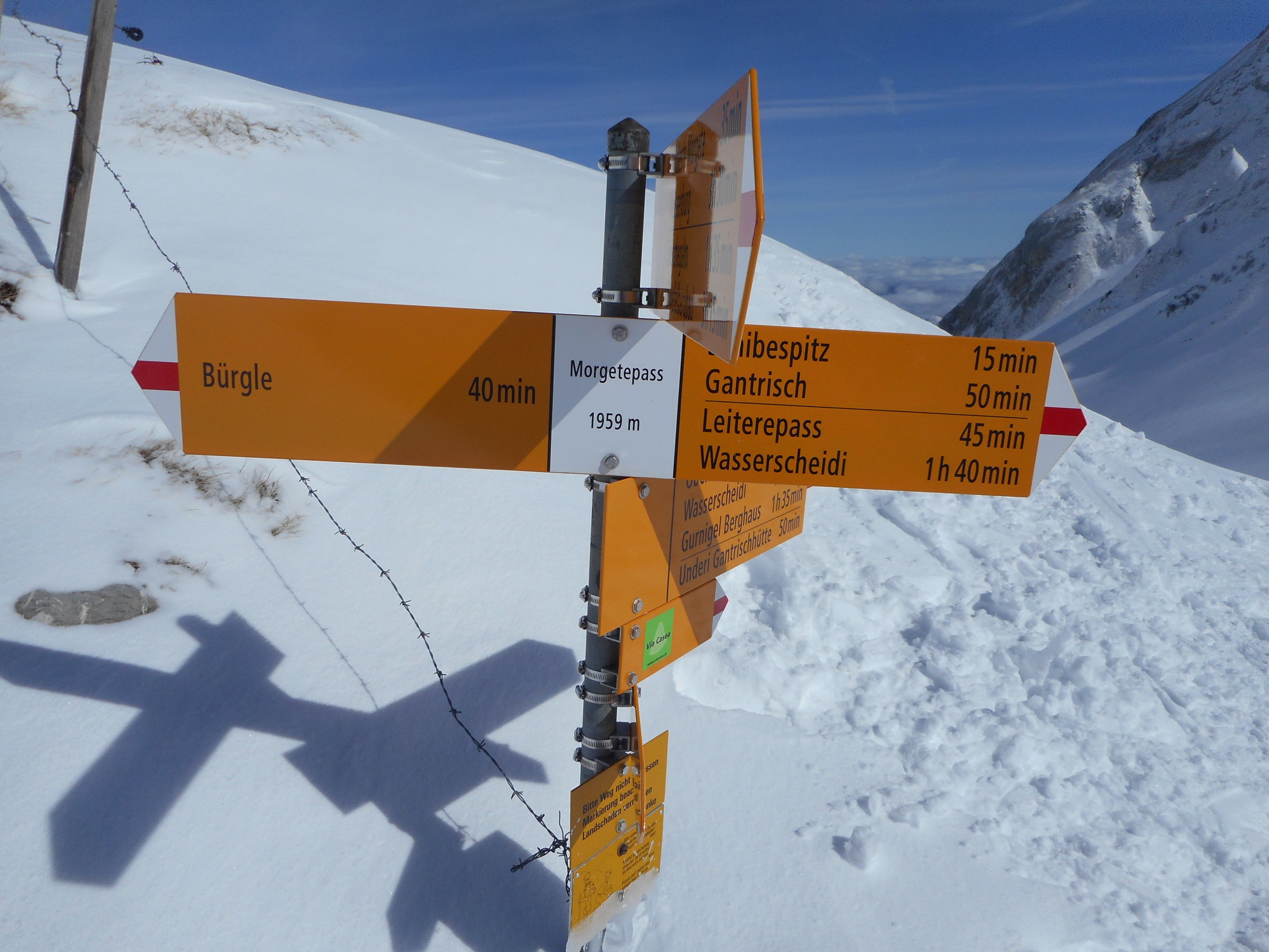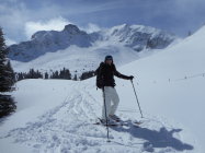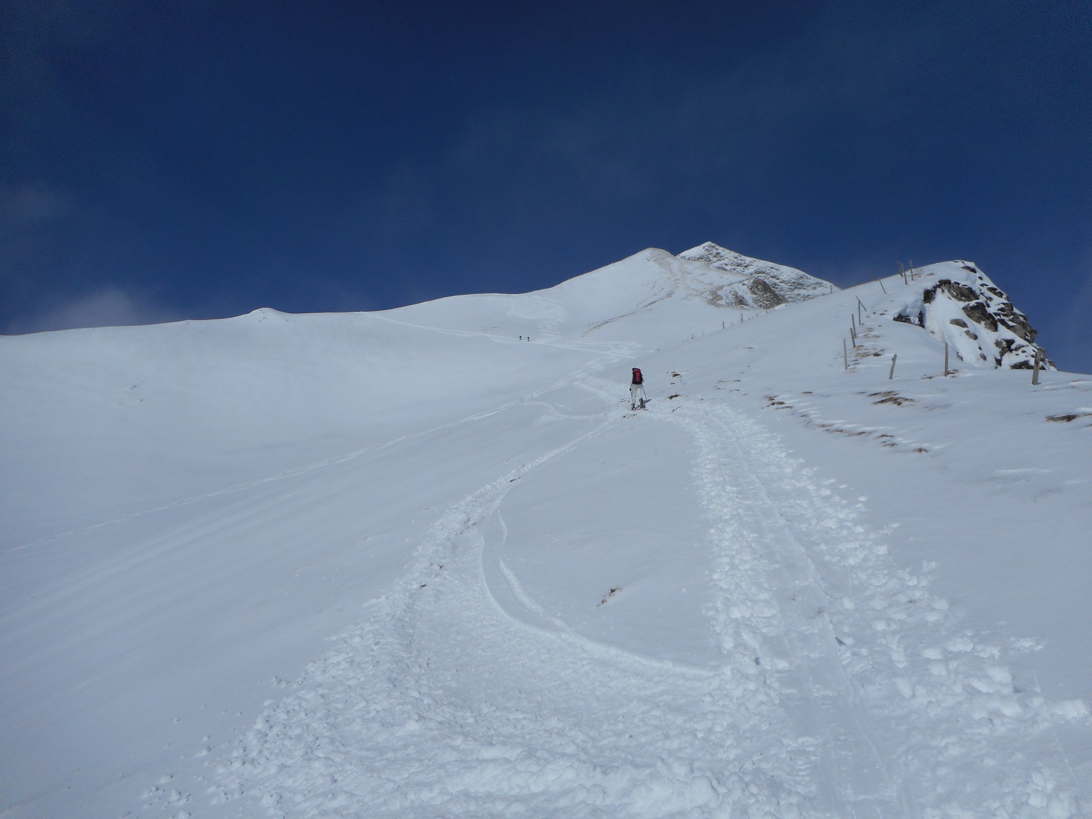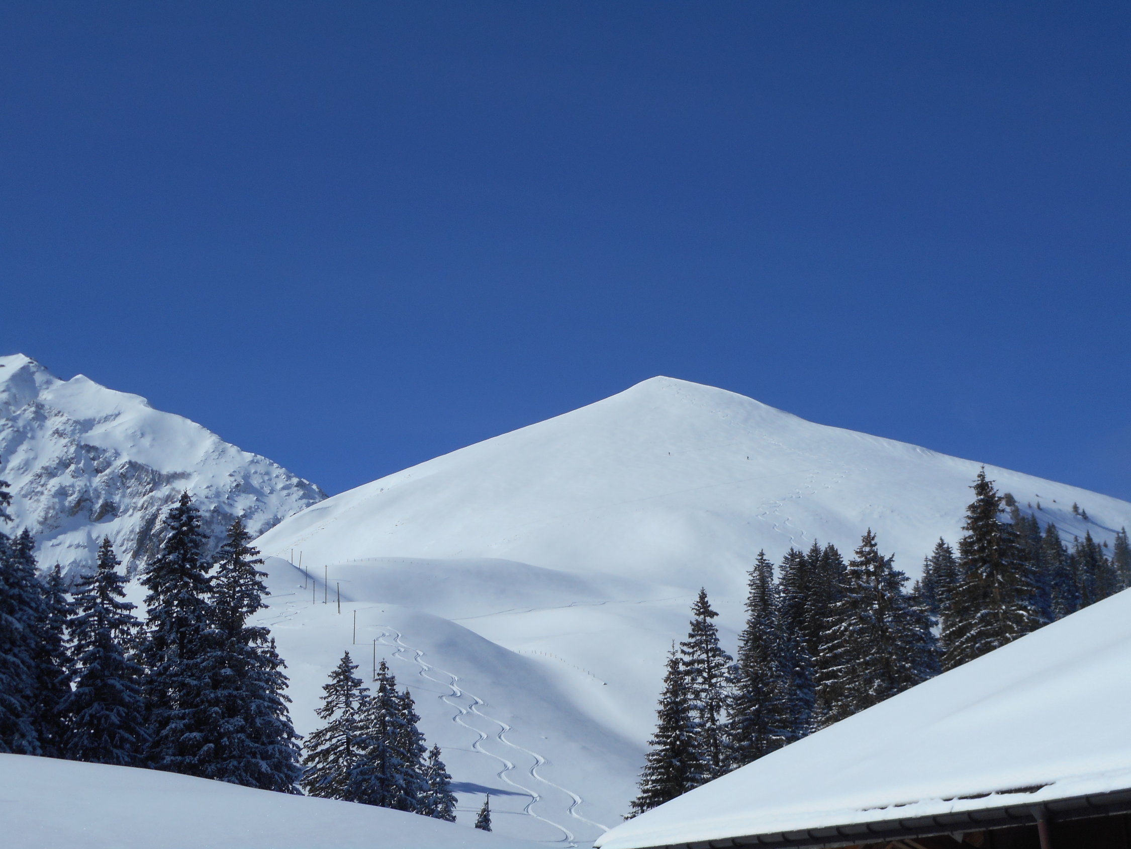 Aufstieg: Die Schneemessstation auf der Unteren Gantrischhütte zeigte heute morgen 18cm Neuschnee an. Es war wunderbarer Pulverschnee auf einer sehr hartgefrorenen Altschneeschicht. Ueber Nacht ist dieser Schnee praktisch ohne Windeinfluss gefallen.