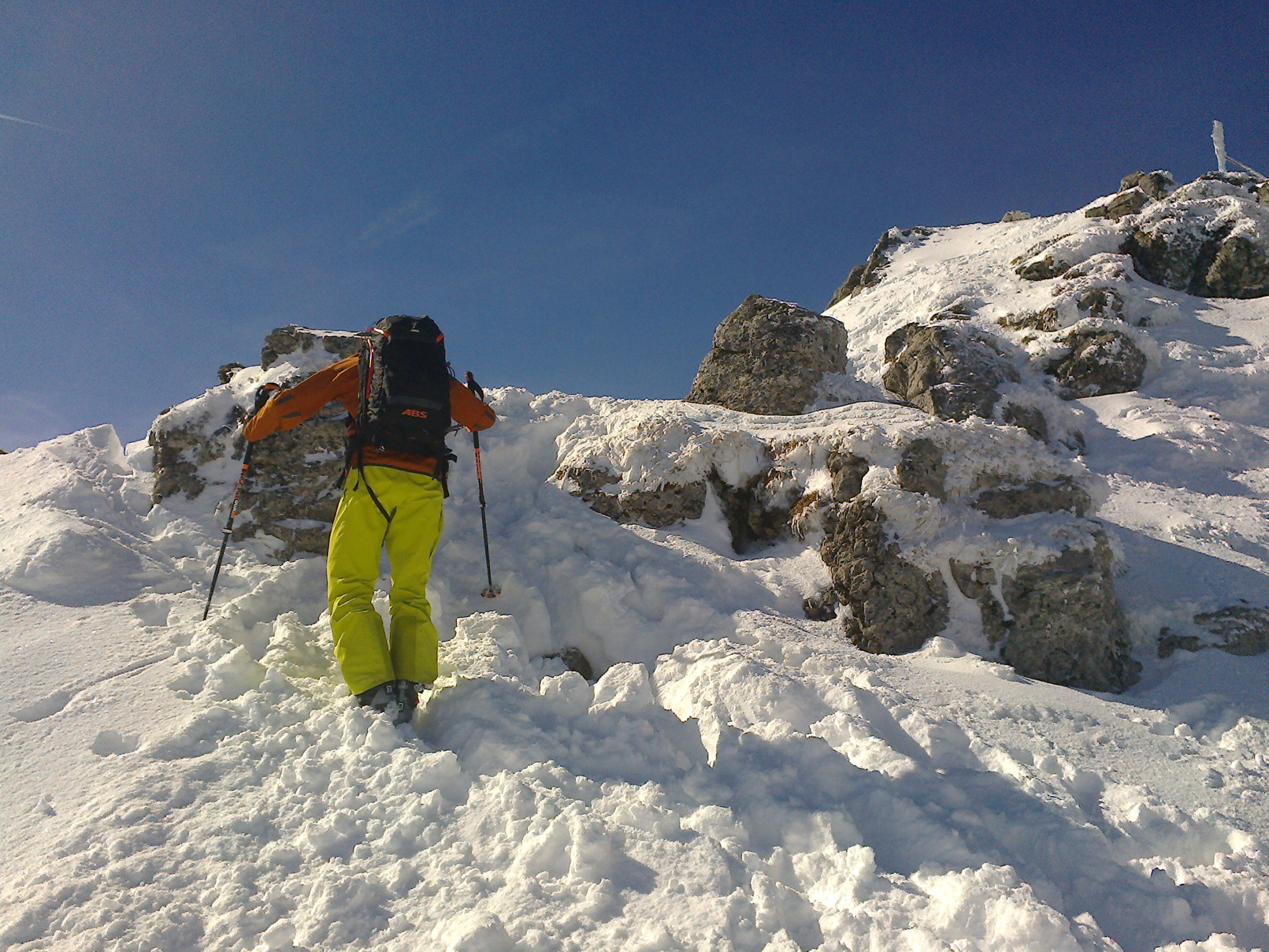 Zwischen 1 cm Neuschnee auf Altschneepiste unten und 20cm Neuschnee auf vergletscherter Wiese oben - super zu fahren (bis auf die Blankeisstellen im oberen Bereich) bei Traumwetter. Vom Skidepot zum Jägerdenkmal guter Trittfirn mit ein paar Schnee-Löchern im Felsbereich.