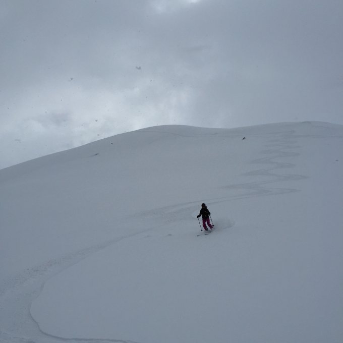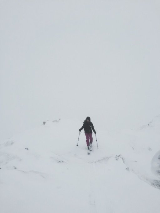 Schnee, Sturm und Nebel. Bei der Abfahrt bogen die Wolken endlich auseinander und gab es gutes Sicht.