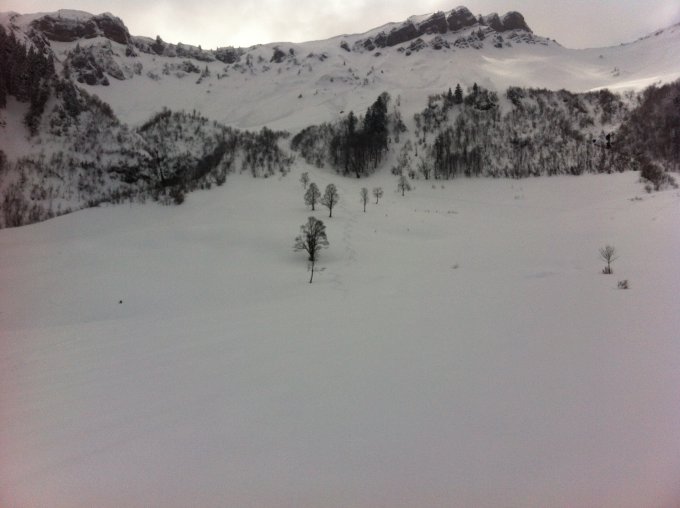 ca. 5-10 cm Neuschnee von gestern, darunter noch mal 20-30 cm vom Donnerstag. Es ist eher Schneemann-Bau-Schnee als Pulver und hockt gut zusammen. Unter 1700m alles gut verbunden, der 2er ist gerechtfertigt. Ab 1800m tritt darunter zunehmend harte Schicht zutage, zu der eine schlechte Verbindung besteht. Vorsicht wäre geboten, wenn der Berg noch höher wäre!