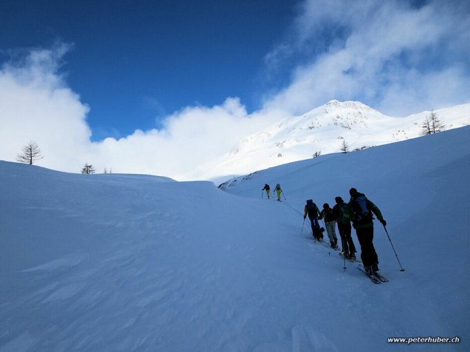 Im Laufe des Tages sehr schön. Oben bissig kalter Westwind. Es hat etwas Neuschnee gegeben. Er ist stark verblasen. In den Mulden windgepresster Neuschnee, schön zu fahren. Gegen den Talboden schon bald recht feucht.