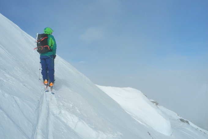 Wenig Neuschnee und nur unwesentliche neue Triebschnee Ansammlungen. Die Schlüsselstelle bei 2857m ist gut mit Schnee gefüllt und problemlos begehbar. Der anschliessende Grat ist total abgeblasen. Harsteisen unerlässlich. Der starke NW-Wind lässt keine Gipfelrast zu.