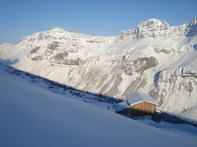 Rund 30 Zentimeter Neuschnee im oberen Bereich, der noch sehr luftig war. Leider waren teilweise die Steine bei Kuppen und in der Traverse zurück zur Bahn mit Schnee überdeckt, weshalb Steinkontakt kaum vermeidbar war. Abfahrt ab Fisetengrat ebenfalls zu Beginn toll, danach wurde der Schnee schwerer.