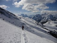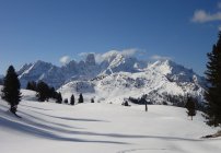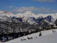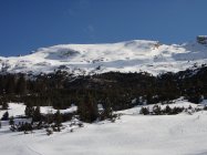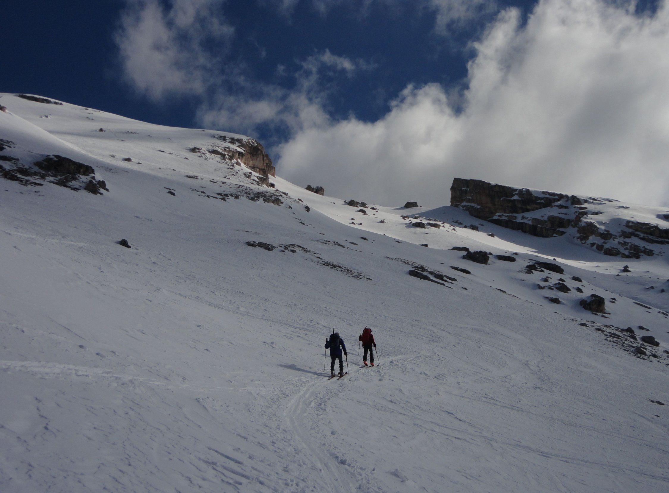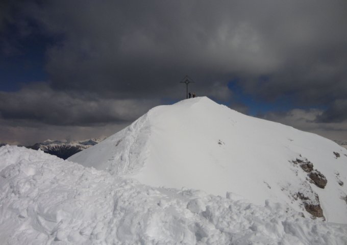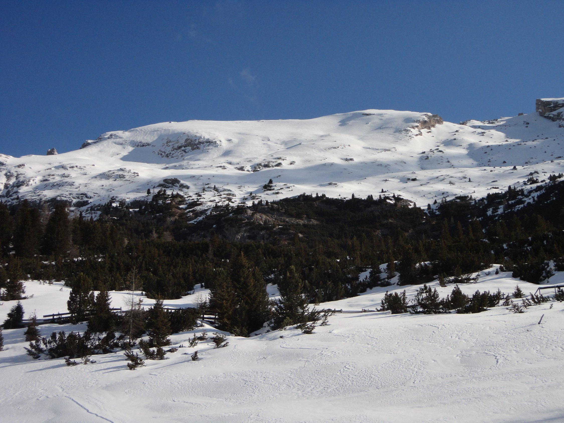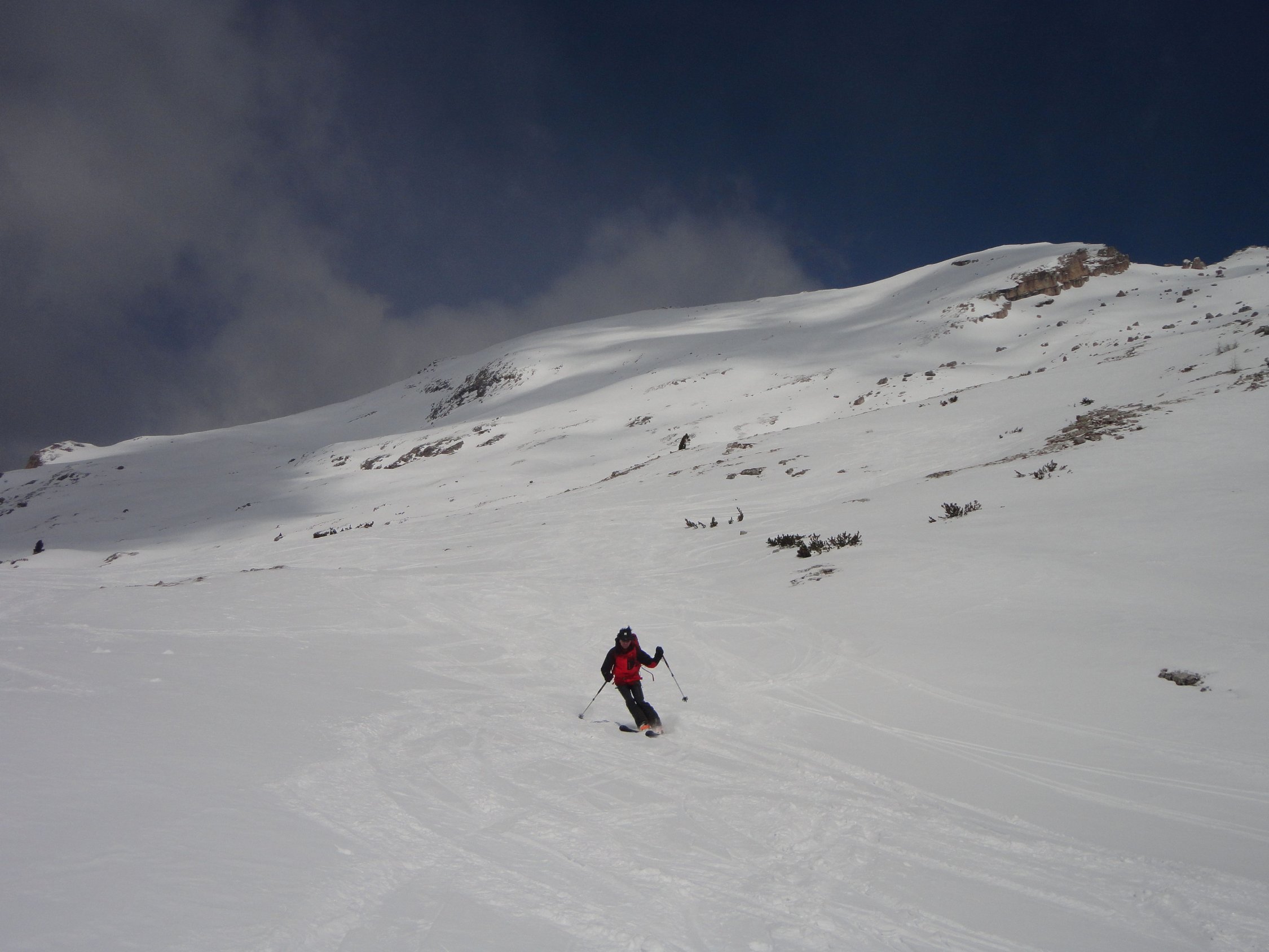 Durch den hohen Ausgangspunkt noch gute Schneelage. Kurze apere Stelle beim Direktaufstieg durch den Latschengürtel, kann aber bei der Abfahrt weiträumig umfahren werden. Abfahrt teils pistenartig, teils etwas Pulver auf hartem Untergrund, stellenweise auch leicht gedeckelt. Nach unten hin zunehmend griffiger.