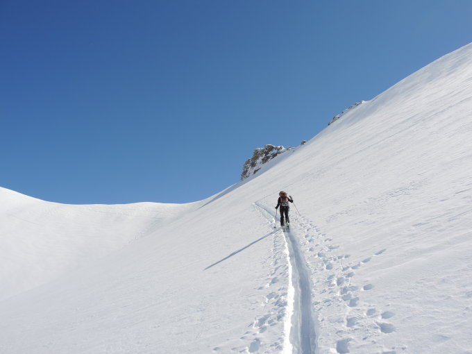 Stark von der Bise bearbeitet Oberfläche. Nur die obersten 500m wirklich schöner Pulverschnee, Rest dann doch dank der Sonneneinwirkung einigermassen fahrbar.