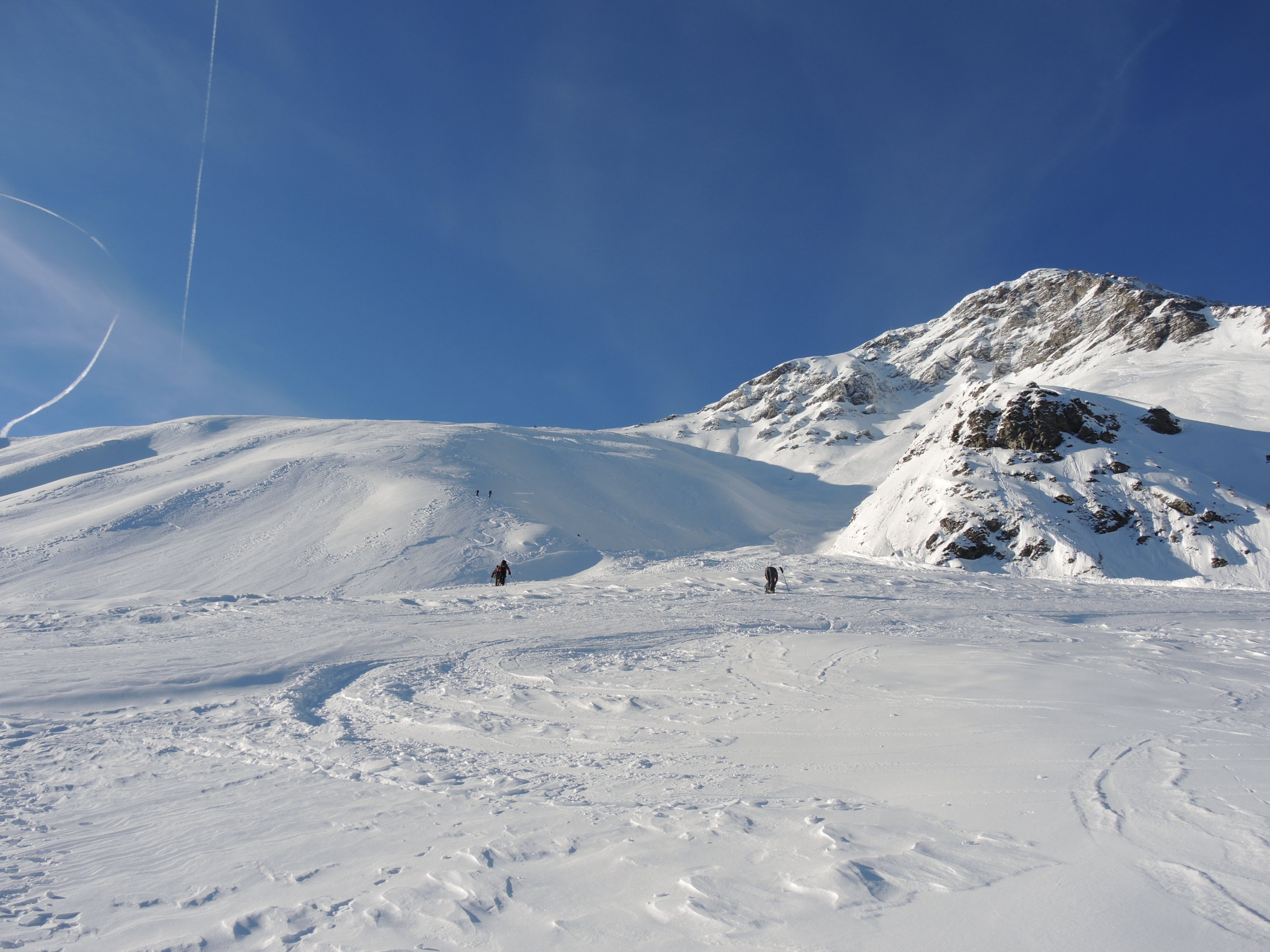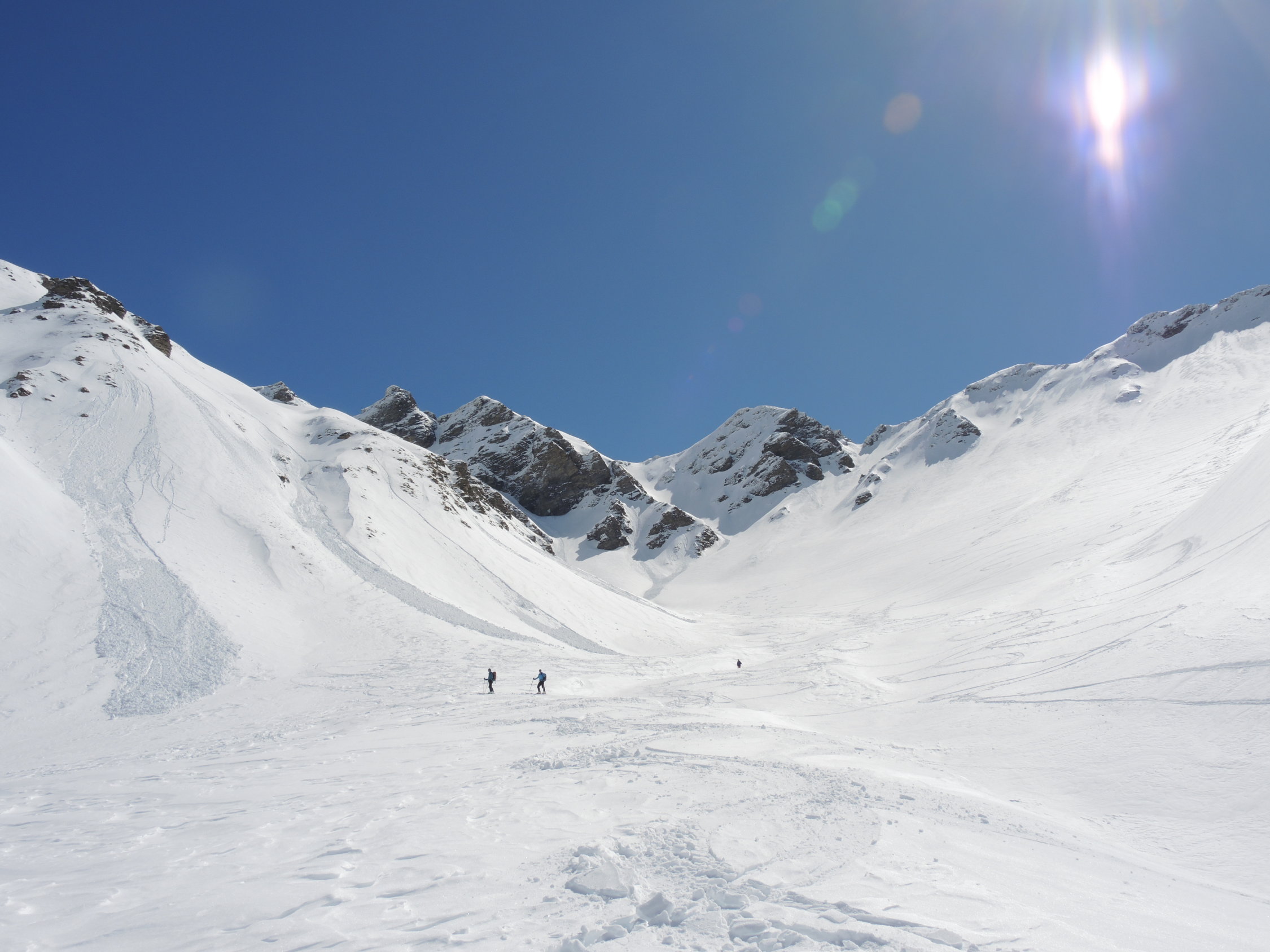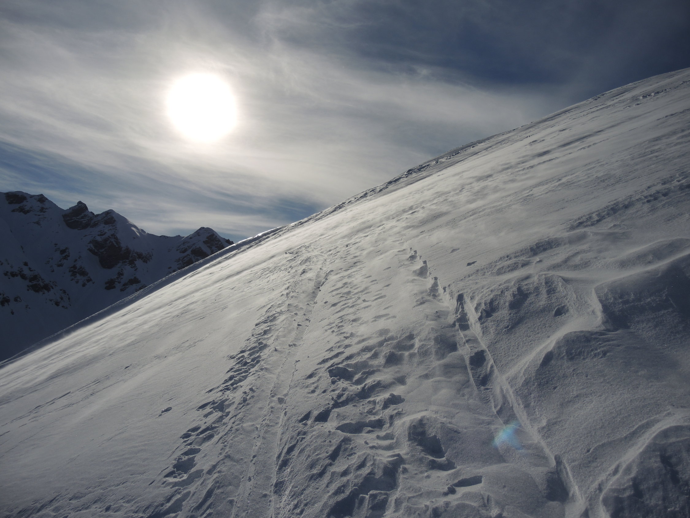 Windharsch, stellenweise Pulver, im Tal fast Sulzschnee, Altes Schneebrettauslösung in den von unten gesehen linken Steilhängen des Grabens. Vermutlich eingeblasener Bisenschnee. Heute Aufstiege über den Rücken neben dem Graben möglich, Abfahrt auf der Normalaufstiegsroute ins Tal Rtg Nordosten ausholend.