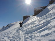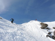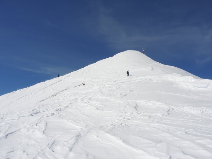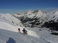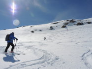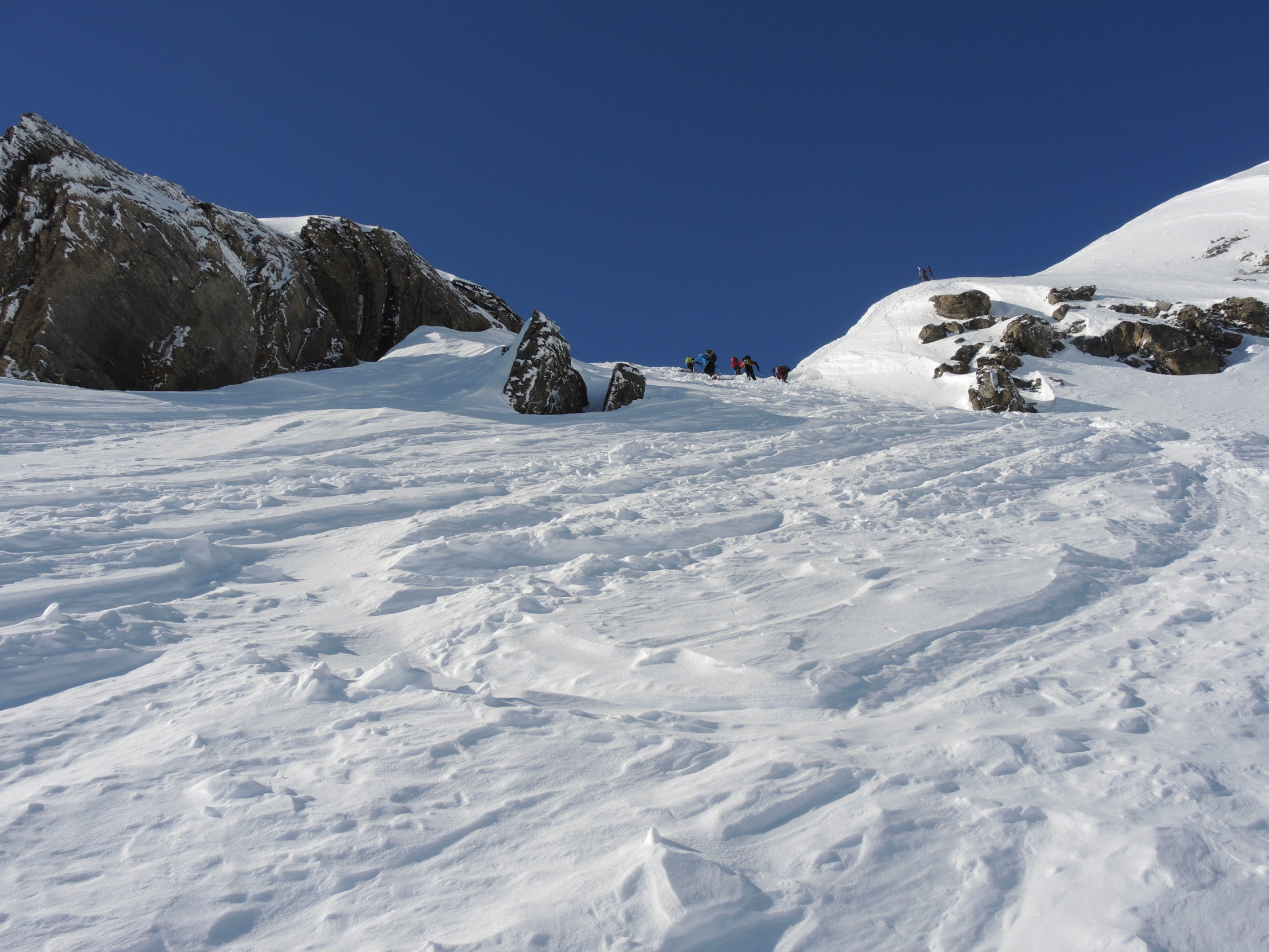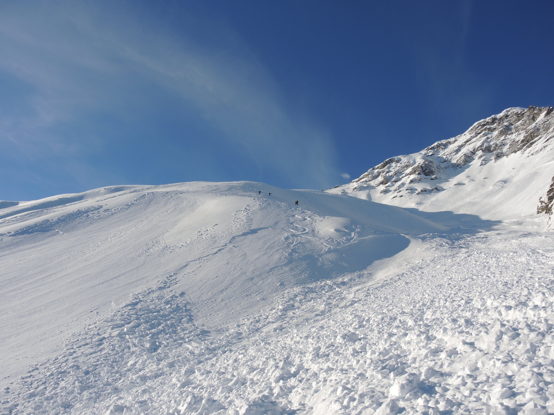 Windharsch, stellenweise Pulver, im Tal fast Sulzschnee, Altes Schneebrettauslösung in den von unten gesehen linken Steilhängen des Grabens. Vermutlich eingeblasener Bisenschnee. Heute Aufstiege über den Rücken neben dem Graben möglich, Abfahrt auf der Normalaufstiegsroute ins Tal Rtg Nordosten ausholend.