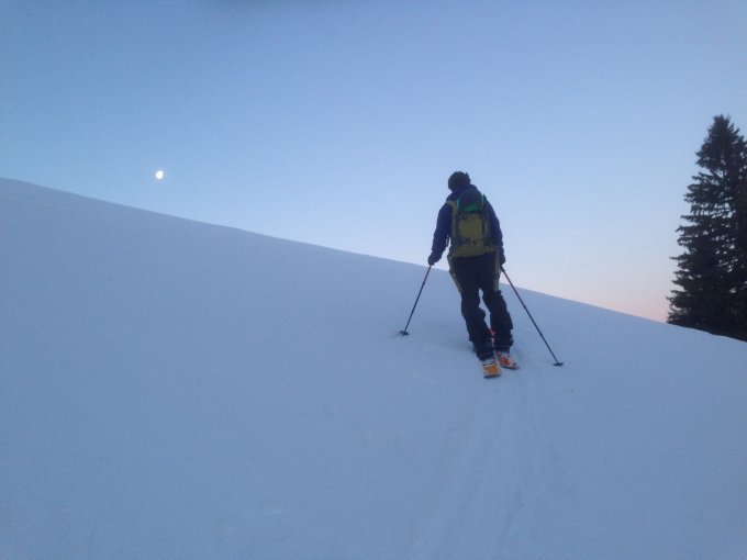 Abfahrt oben in der Westseite kurz noch sehr hart, dann im Nordcouloir noch schöner Pulver weiter unten gut fahrbare Lawine abwechselnd mit leichtem Bruchharst. Zum Schluss noch schön tragende zum Teil aufgesulzte Schneedecke.