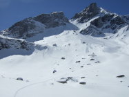 Abfahrt über Chären und Chalchenhorn Couloir auch keine alte Spur ersichtlich. Dafür ein Abgang rechts vom Couloir, der im Tagesverlauf abging.