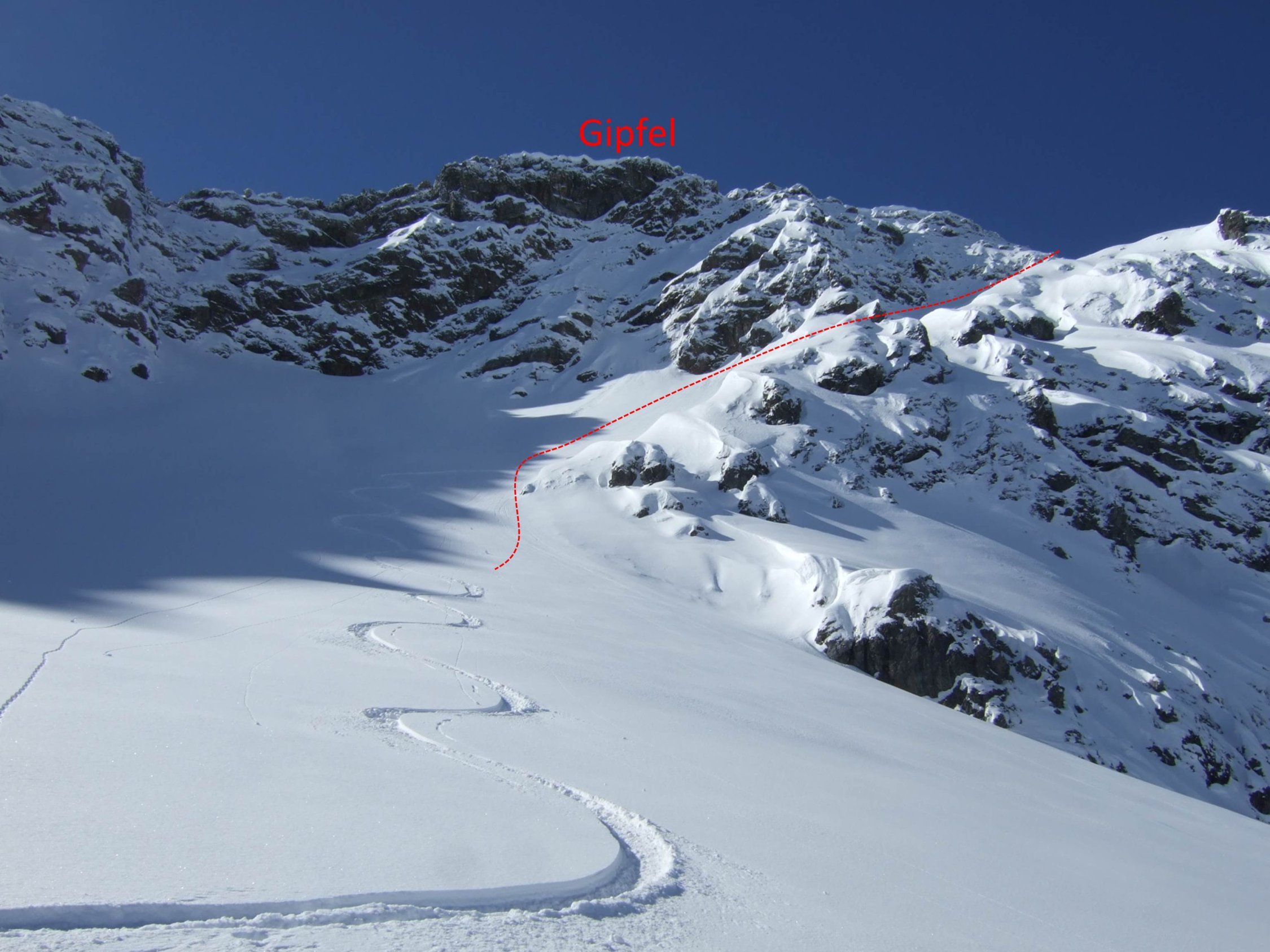 Abfahrt über NO Rinne, die ca. 100m westlich vom Gipfel losgeht. Man kann gut mit den Ski dorthin abfahren. Dann bis zum Grüenseeli (1811) noch Pulver gefunden - genial.