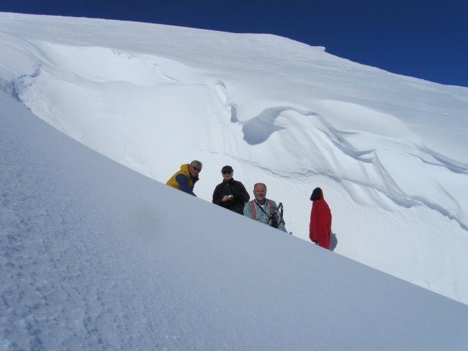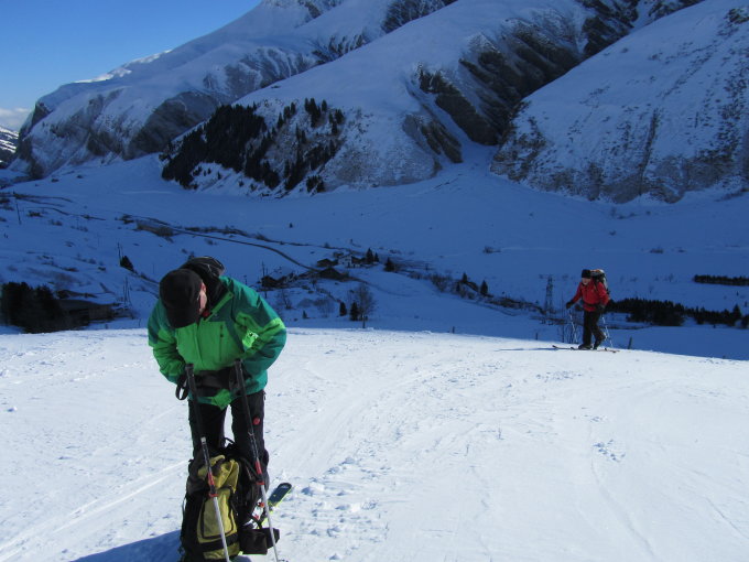 Beim Start um 9 Uhr am Turrahus sehr kalt und windig. Mittags fast windstill und angenehm warm. Wolkenlos, Pulverschnee. Noch keine Spur am Gipfelgrat. Dieser war stark verwechtet und schien uns zu heikel. Deshalb auf Punkt 2760 umgekehrt.