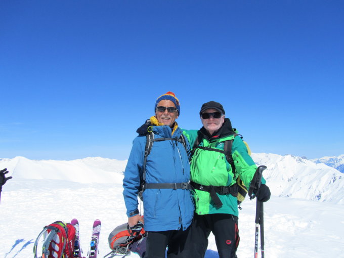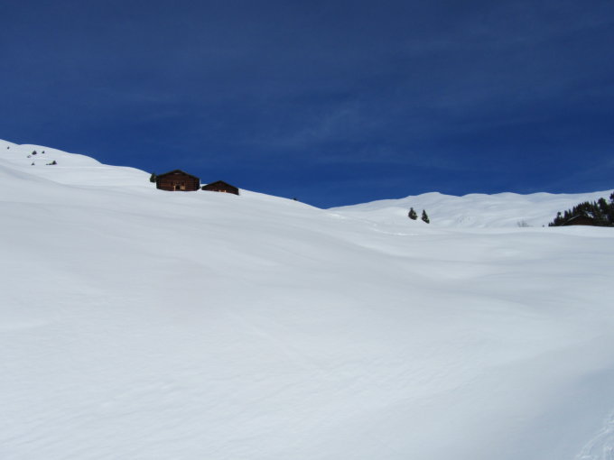 Wolkenlos, fast windstill, gute Fernsicht, Pulverschnee oben, unten aufgeweichter Faulschnee. Viel, viel Platz zum Fahren im unverspurten Gelände.