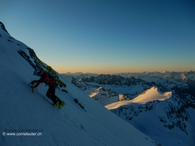 Die Verhältnisse sind alles andere als optimal... die Südwand Route welche wir machten hatte am 8.April noch kein Firn und immer noch da und dort Triebschnee. Auf dem Gipfel harter Schnee... teils glasig vereist, Steigeisen... Abstieg bei der Mure de la Cote zwar kein Blankeis aber harter Schnee. Abfahrt im Le Corridor teils mit Eisbrocken gespickt.... und die drohenden Gletscherabbrüche und Seracs entweder halten diese oder nicht.... fast wie Russisch Roulette.... grrr.