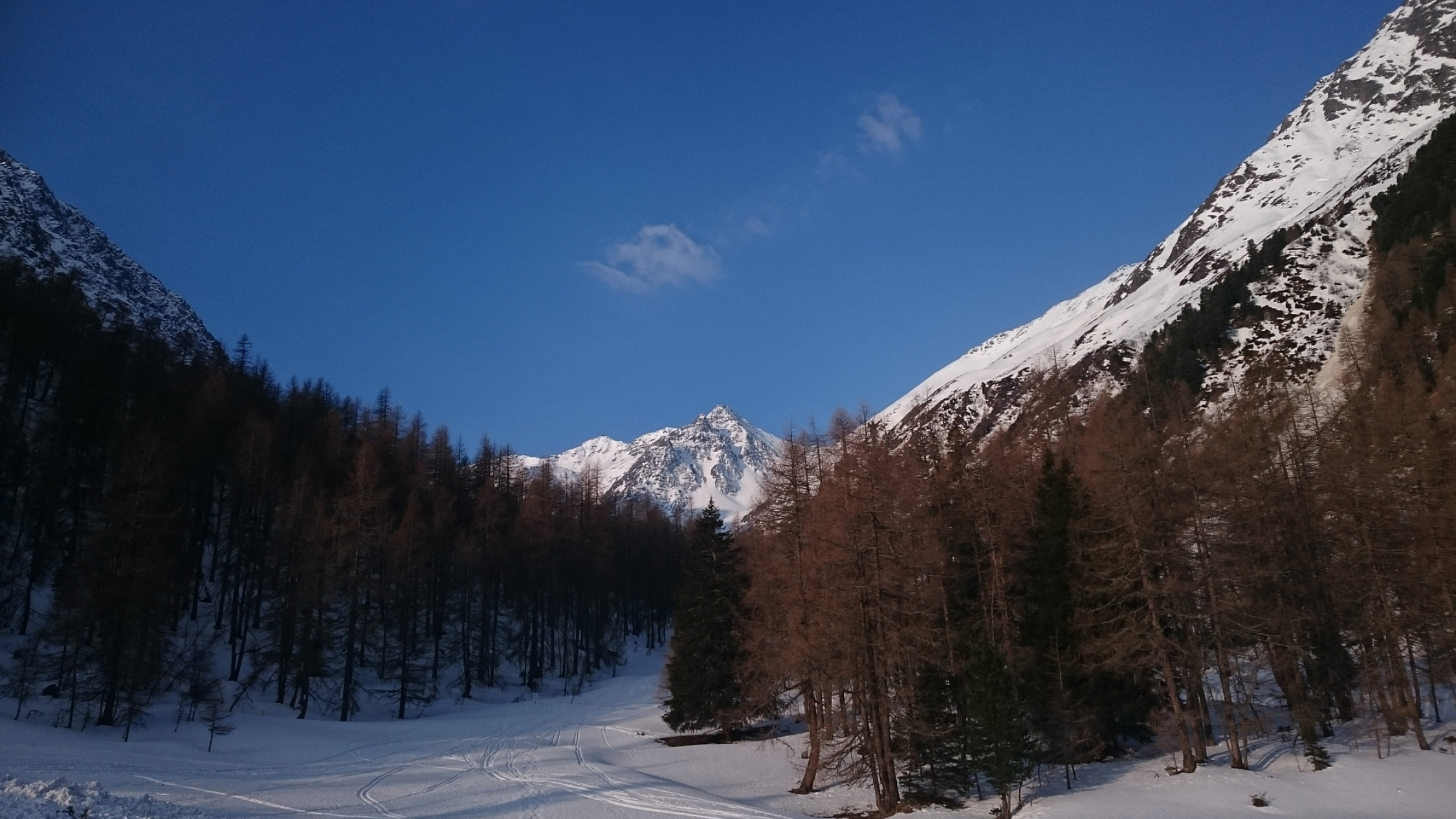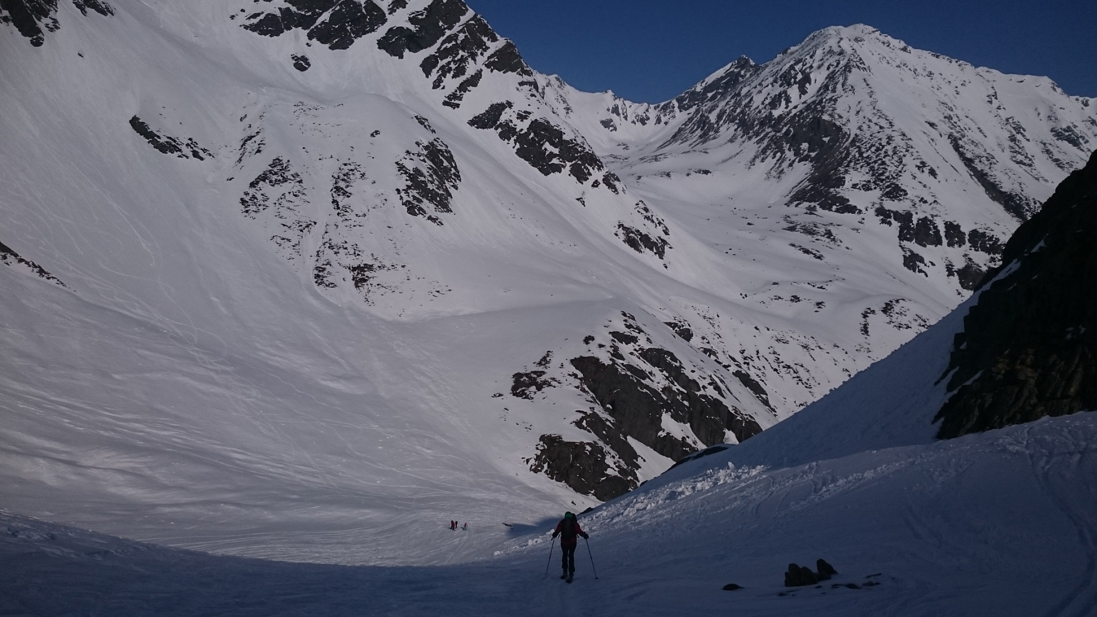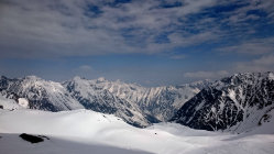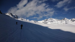 Wir sind deshalb nach Süden in das Gleirschtal abgefahren. Hier recht gute Firnverhältnisse, kaum Spuren drin und auch von Lawinen nicht zerfurcht. Ab Hütte dann eher sumpfiger und klebriger Schnee, trotzdem auf der Pistenraupenspur ganz gut zu fahren.