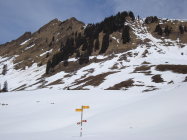 Im Tal, Höhe Alpweg zur UsserstHütte, leckt der Frühling massiv an der Schneesubstanz. Besser auf der Talsohle im Wald zurück.