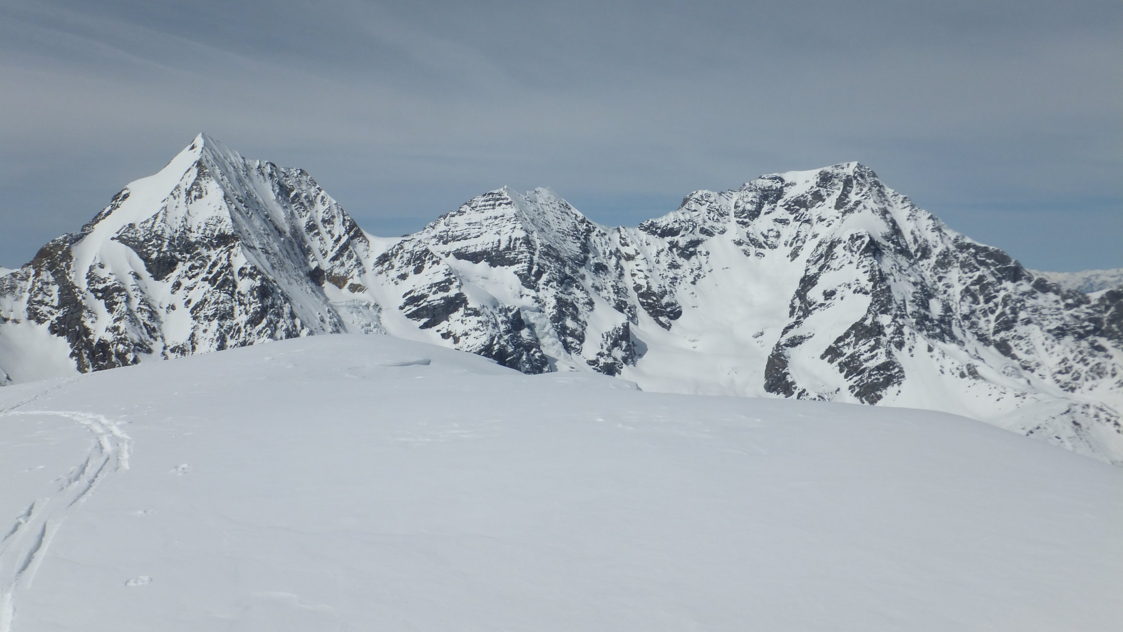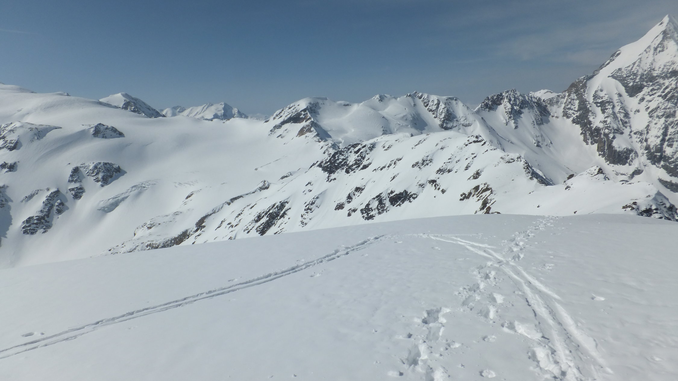 Zuerst vom Butzental auf die Butzenspitze, kurze Abfahrt über den Westhang und Querung zum Ostgrat der Eisseespitze. Vor dem Gipfelaufbau mit aufgebunden Ski über die Felsen zum Gipfel. Abfahrt und Querung zum Eisseepaß. Abfahrt über den Suldenferner ins Skigebiet, etwas oberhalb der Schaubachhütte. Aufstieg zum Madritschjoch und Abfahrt zur Zufallhütte.