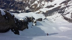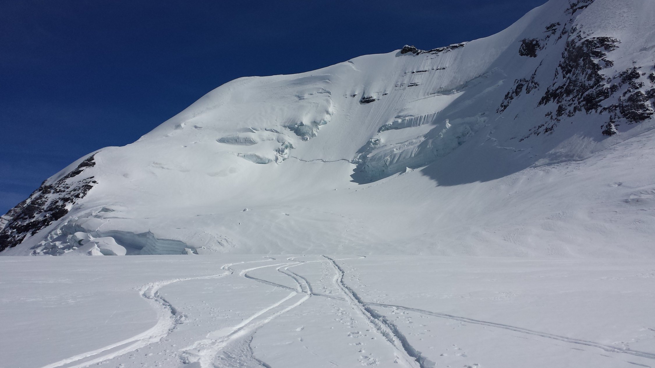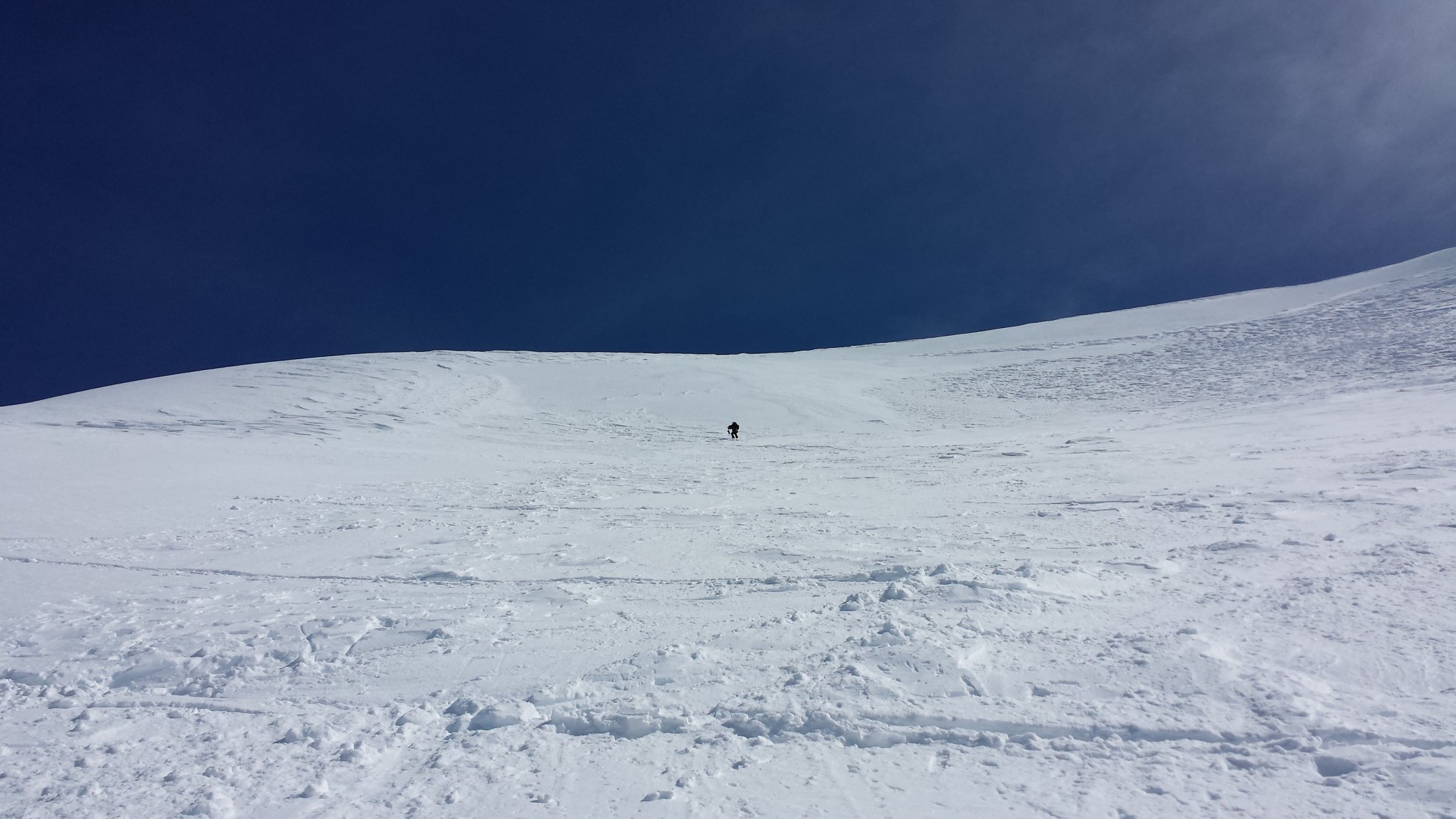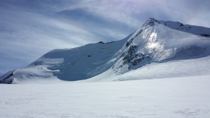 Bis zum Skidepot bei 3500m konnte man mit Harscheisen gut gehen. Gletscher gut eingeschneit, kaum Spalten sichtbar. Ab Skidepot sind wir zu Fuss mit Steigeisen und Pickel bis zum Gipfel ohne blanke Stellen, aber teilweise doch recht hart auf Frontzacken. Abwechselnd aber auch wieder guter Trittschnee.
