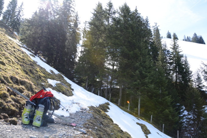 Abfahrt auf Schneeresten entlang der Strasse im Schattigen Graben des Stafelbach bis auf 1130m möglich.
