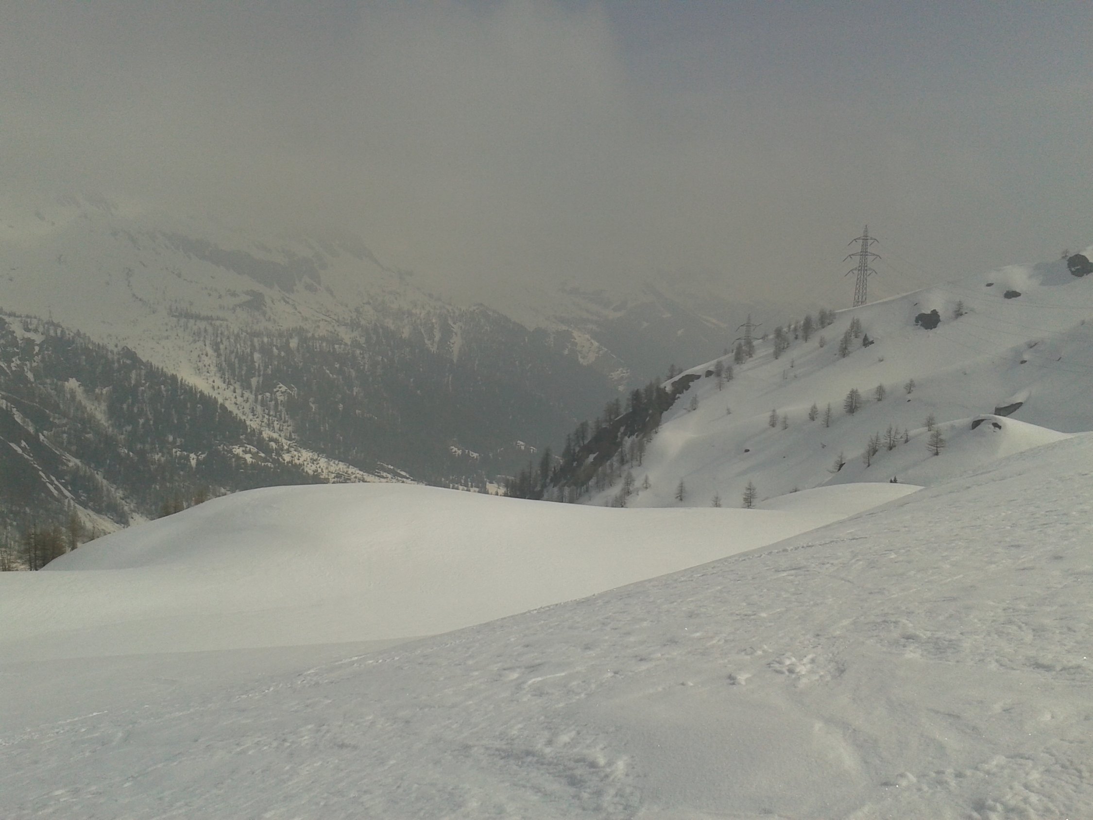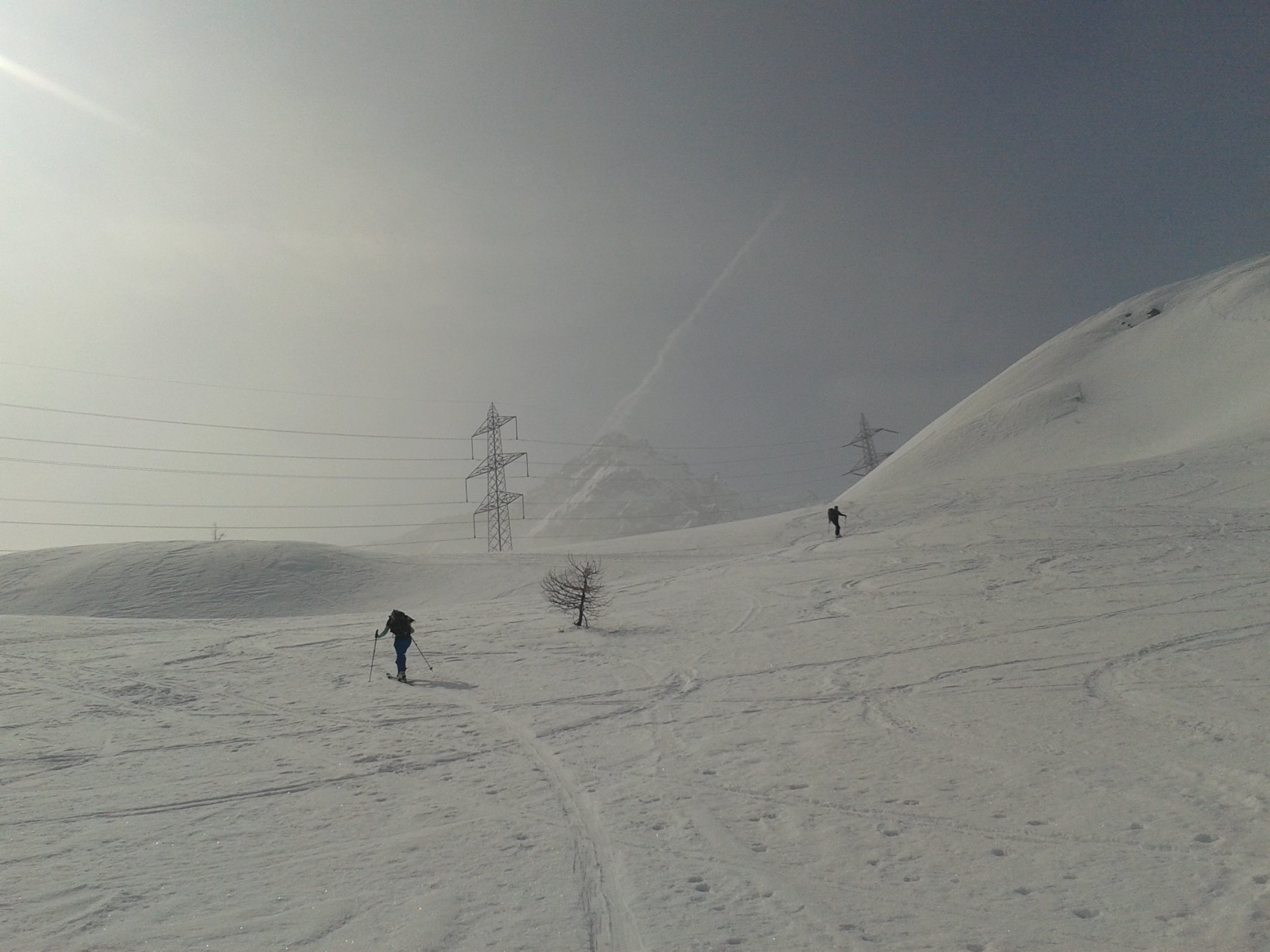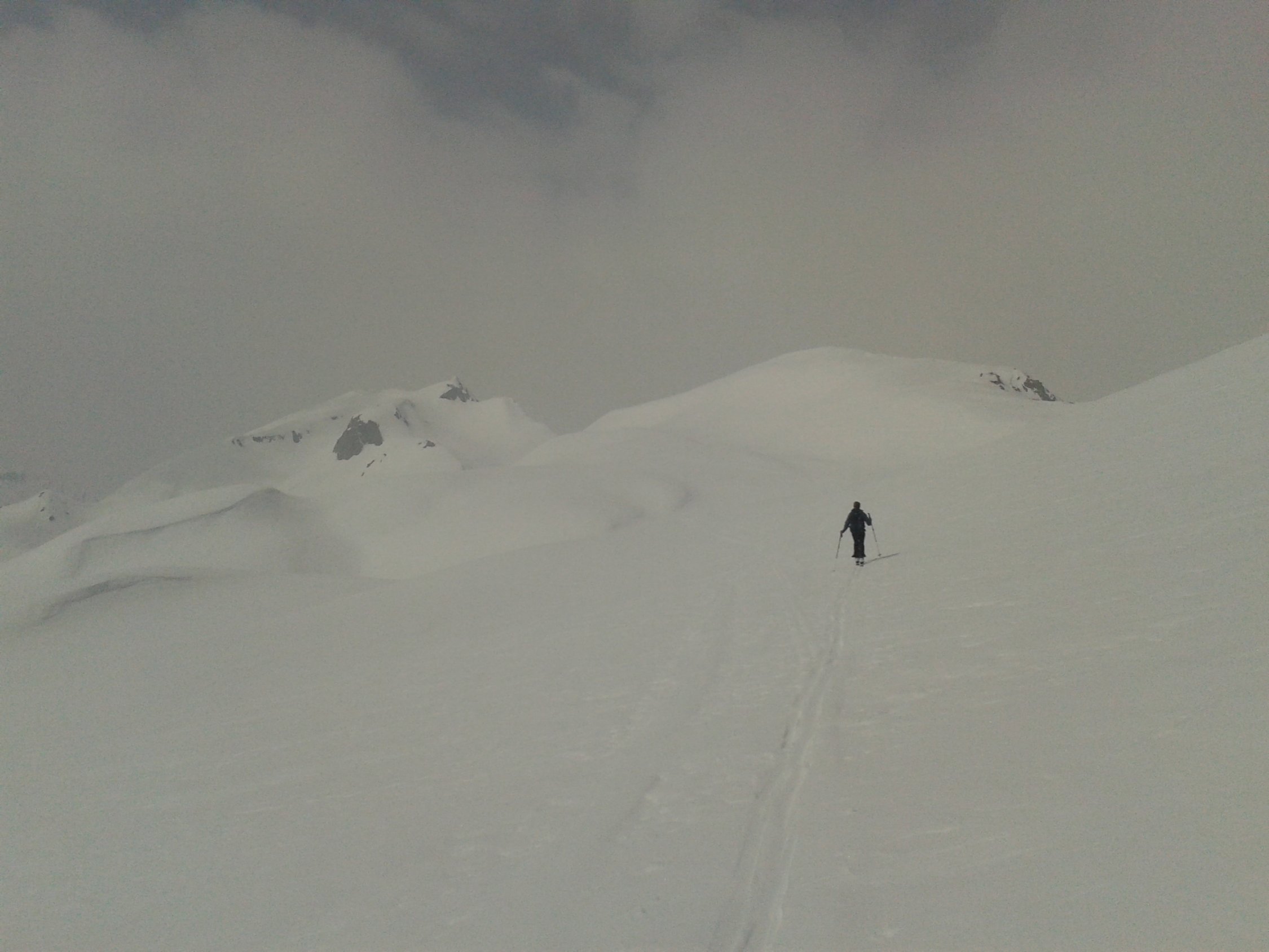 Durch die geringe Abstrahlung in der Nacht auf Samstag Sulz und durchfeuchteter Schnee bis zum Gipfel. Der Sulz war aber sehr gut zu fahren und hat richtig Spass gemacht - soweit wir Sicht hatten. Wir sind wegen einziehenden Nebels nicht wie geplant durchs Valrossa sondern nordöstlich des P 2628 vorbei gerade zum Stausee und dann oberhalb zur Hütte gequert
