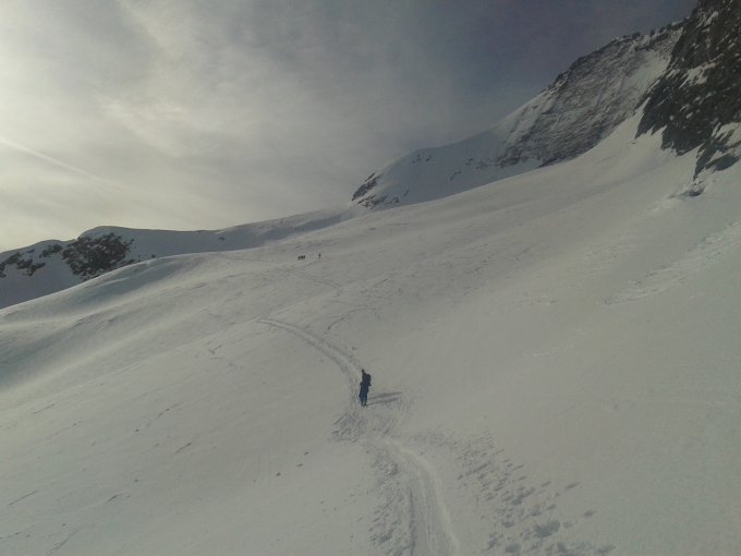 Im Couloir zur Kastellücke hartgefrorener Schnee. Aufstieg ohne Harscheisen machbar, aber mit deutlich bequemer. Die als heikel beschriebene Querung nach der Kastellücke ist gut machbar. Der Schnee morgens angenehm weich aber fest. Insgesamt alles gut eingeschneit, keine Spalten sichtbar. Am Gipfel guter Trittfirn. In der Abfahrt bis auf ca. 2800. m geringe Pulverauflage. Gut fahrbar, allerdings mit Windgangeln durchsetzt.