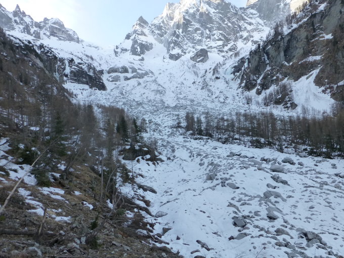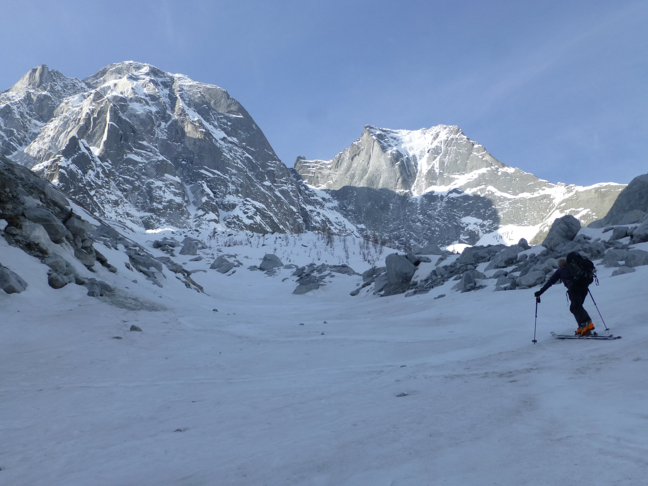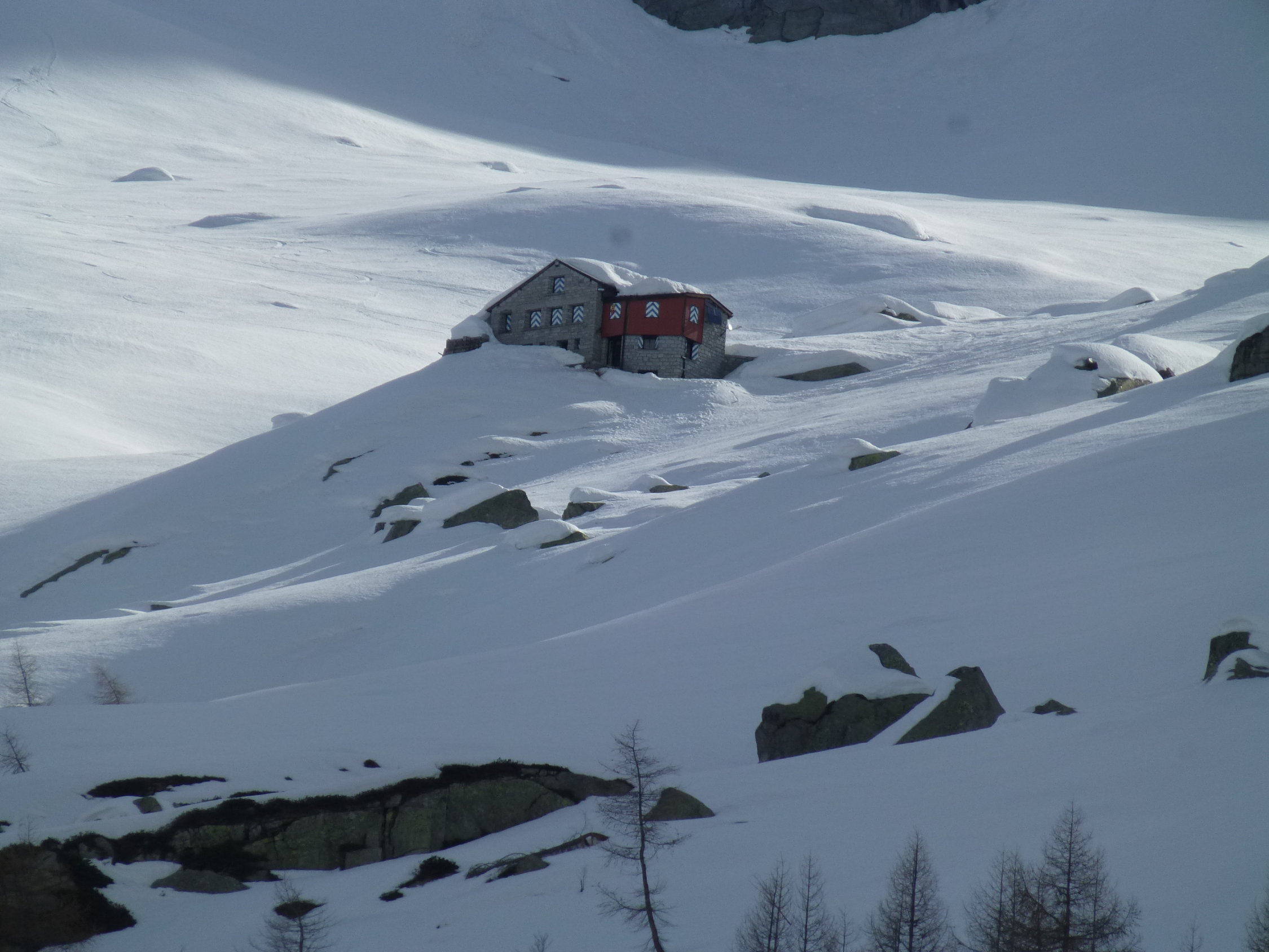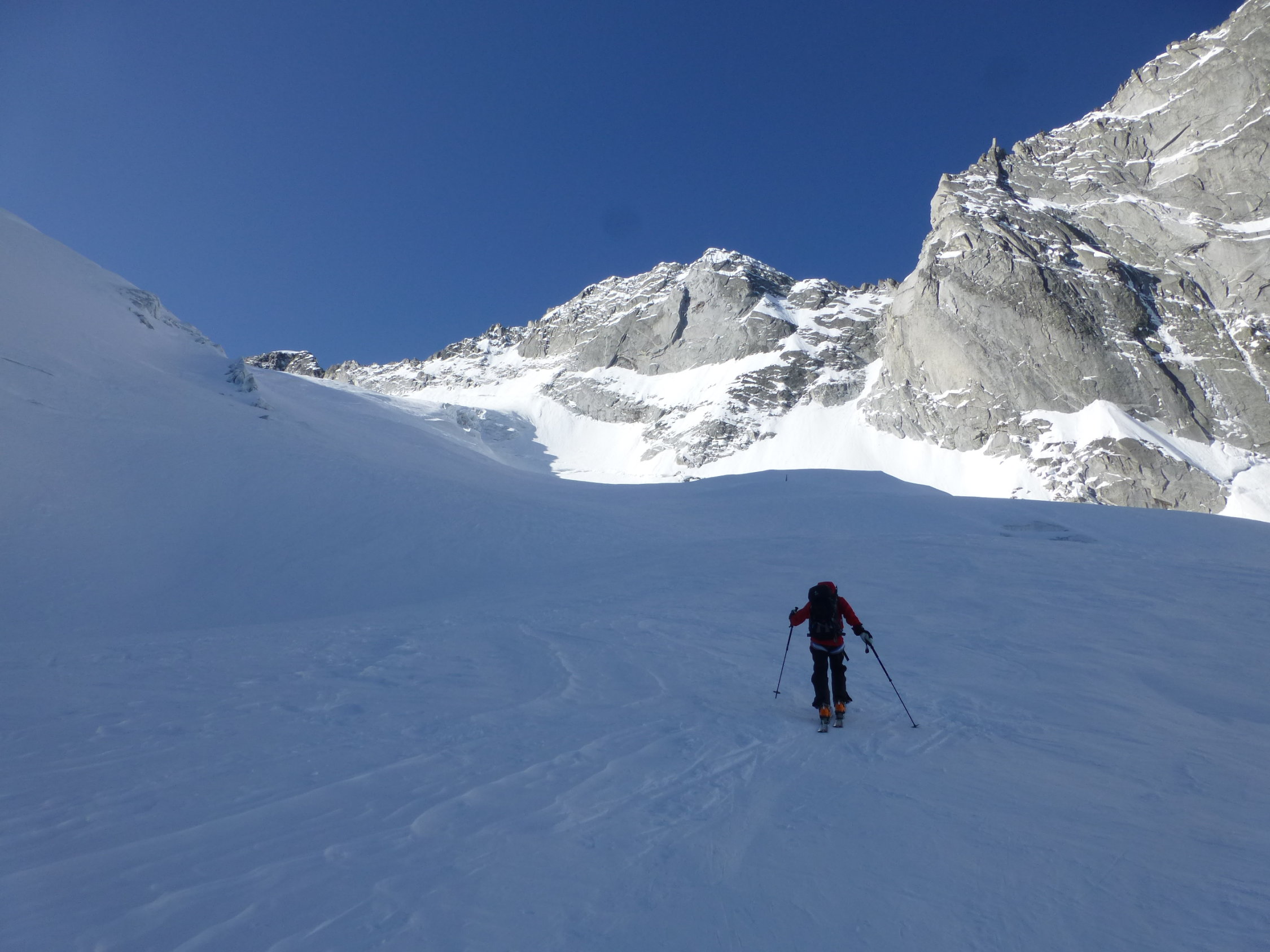 Wenn es weiterhin so warm bleibt, wird der Hüttenzustieg im untersten Bereich wohl bald prekär. Oberhalb ca. 1600 m herrschen hingegen gute Verhältnisse. Vor allem im mittleren Teil des Bondasca-Gletschers öffnen sich aber immer mehr Spalten. Klare Nächte mit guter Abstrahlung und damit eine tragfähige Schneedecke bleiben daher wichtig.