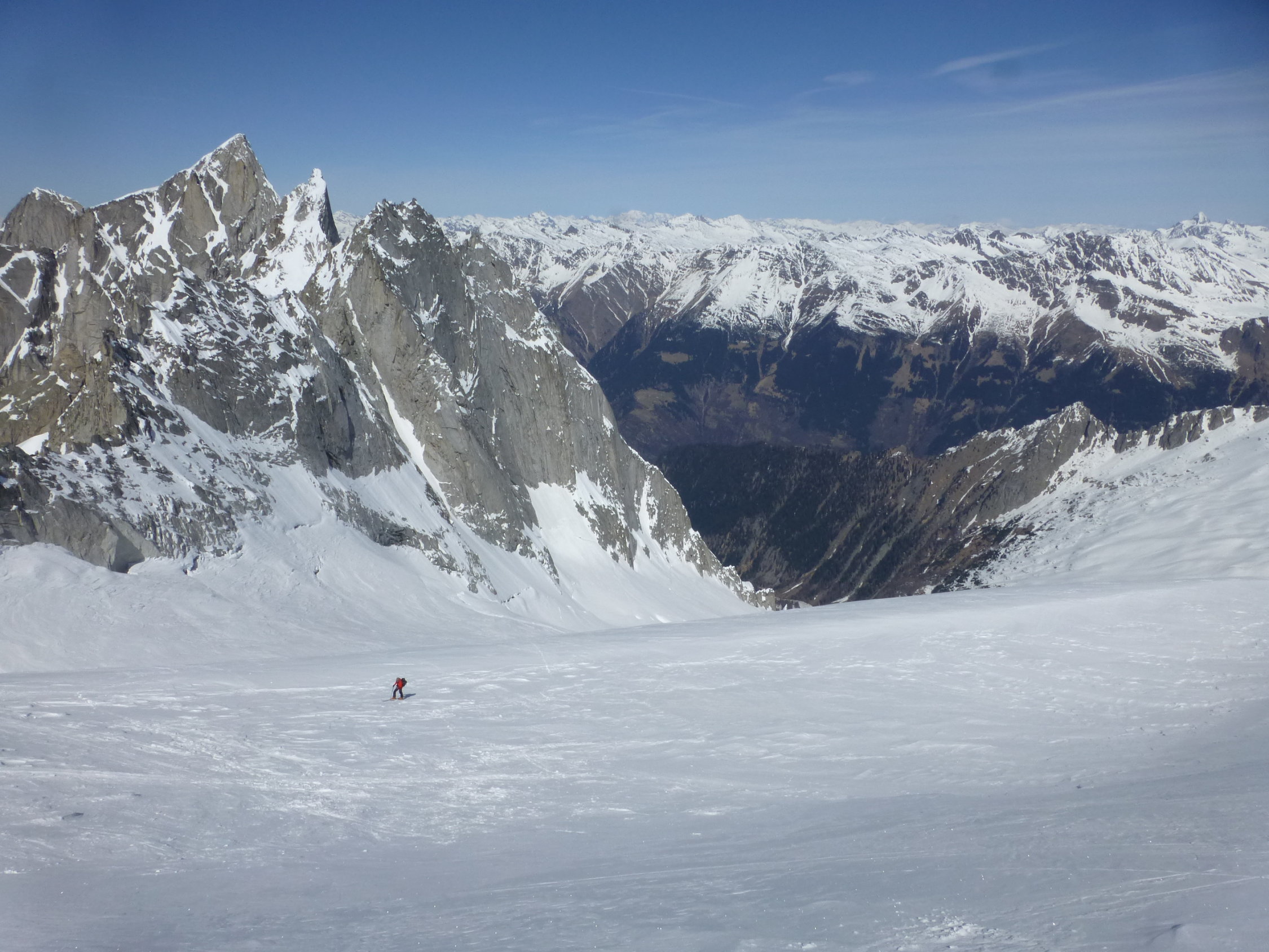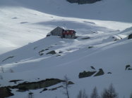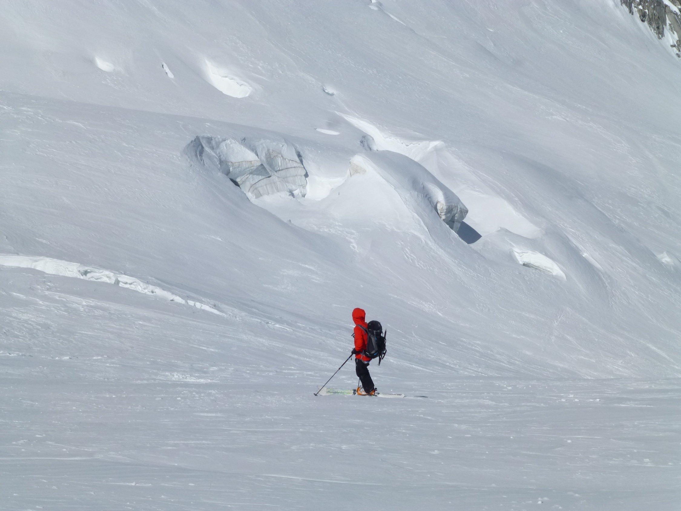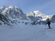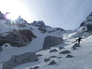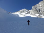 Dank Nächten mit sehr guter Abstrahlung waren die Bedingungen sowohl beim Hüttenzustieg (12.4.) als auch bei der Gipfelbesteigung und der Abfahrt (13.4.) bis um die Mittagszeit ideal: Beim Aufstieg tragfähig gefroren, bei der Abfahrt bis ca. 2800 m hart, weiter unten ein paar Zentimeter Sulz auf tragender Unterlage.