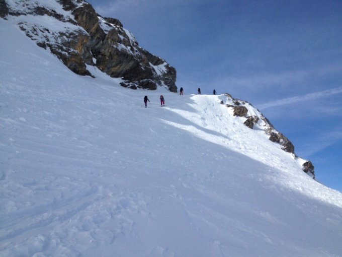 Gute Verhältnisse, die kleine Steilstufe kann gut mit den Skiern gegangen werden.